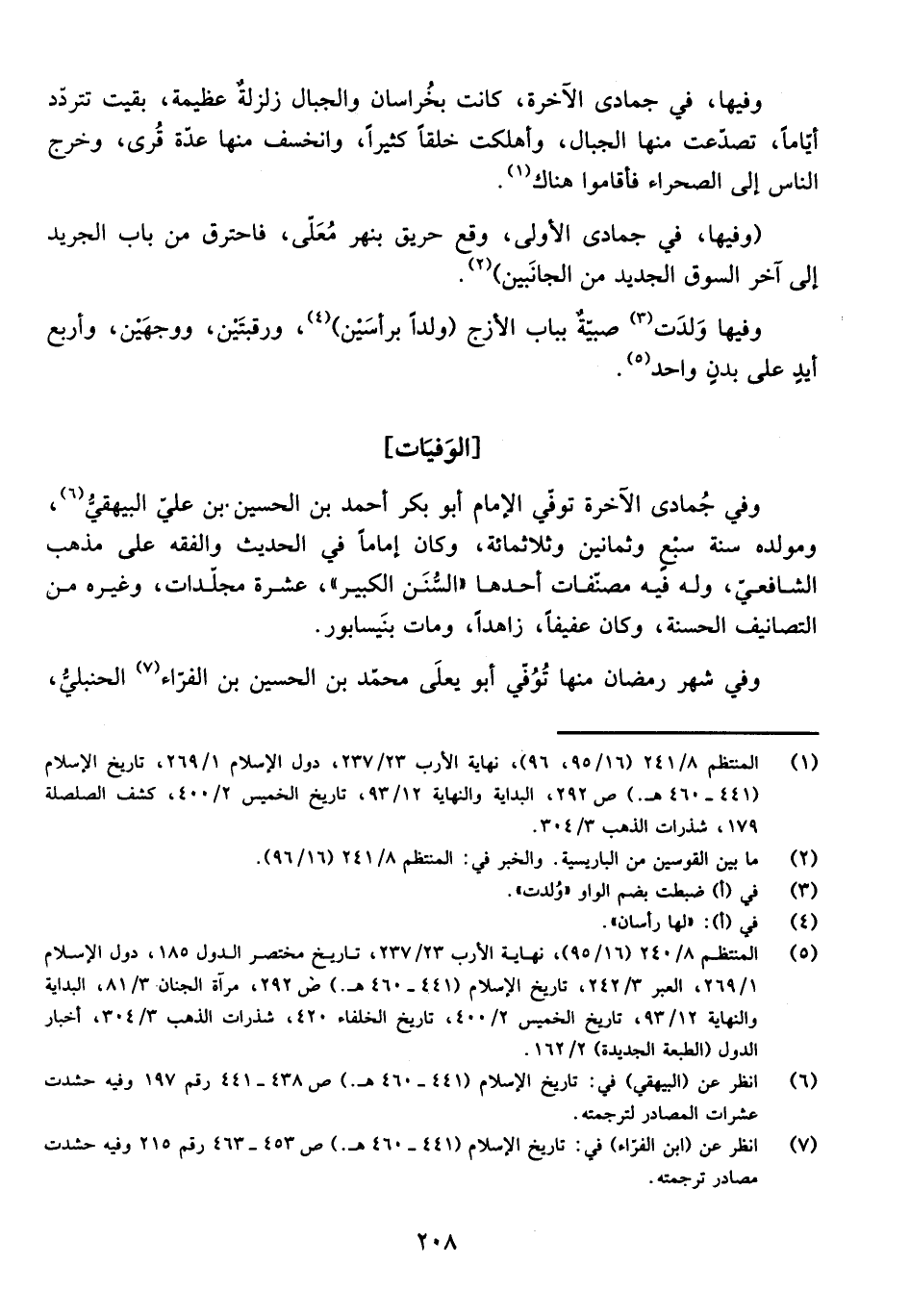 وَفِي جُمَادَى الْآخِرَةِ تُوُفِّيَ الْإِمَامُ أَبُو بَكْرٍ أَحْمَدُ بْنُ الْحُسَيْنِ بْنِ عَلِيٍّ الْبَيْهَقِيُّ وَمَوْلِدُهُ سَنَةَ سَبْعٍ وَثَمَانِينَ وَثَلَاثِمِائَةٍ، وَكَانَ إِمَامًا فِي الْحَدِيثِ وَالْفِقْهِ عَلَى مَذْهَبِ الشَّافِعِيِّ، وَلَهُ فِيهِ مُصَنَّفَاتٌ أَحَدُهَا: " السُّنَنُ الْكَبِيرُ "، عَشَرَةُ مُجَلَّدَاتٍ، وَغَيْرُهُ مِنَ التَّصَانِيفِ الْحَسَنَةِ وَكَانَ عَفِيفًا، زَاهِدًا، وَمَاتَ بِنَيْسَابُورَ. وَفِي شَهْرِ رَمَضَانَ مِنْهَا تُوُفِّيَ أَبُو يَعْلَى مُحَمَّدُ بْنُ الْحُسَيْنِ بْنِ الْفَرَّاءِ الْحَنْبَلِيُّ،