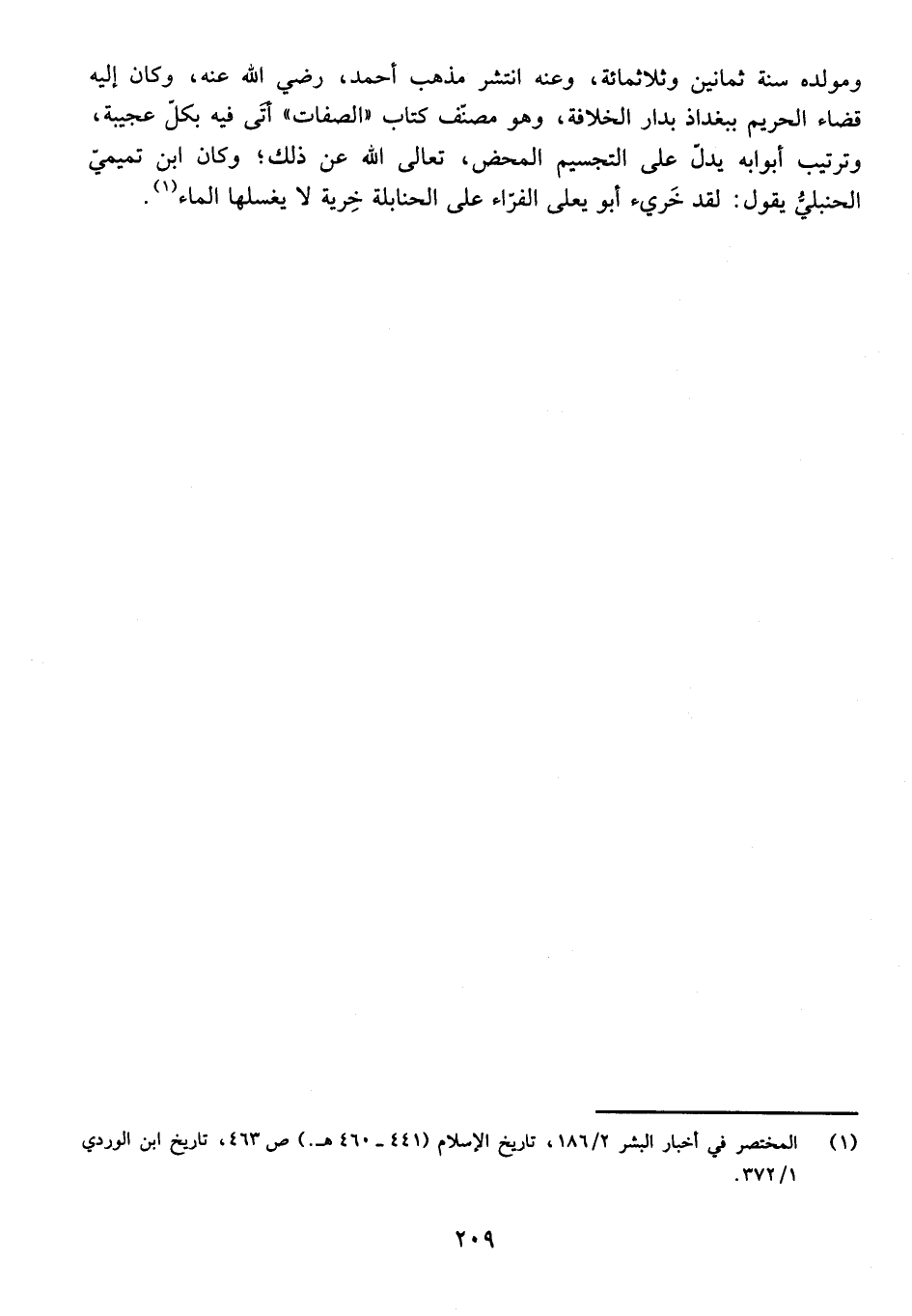 وَمَوْلِدُهُ سَنَةَ ثَمَانِينَ وَثَلَاثِمِائَةٍ، وَعَنْهُ انْتَشَرَ مَذْهَبُ أَحْمَدَ، رَضِيَ اللَّهُ عَنْهُ، وَكَانَ إِلَيْهِ قَضَاءُ الْحَرِيمِ بِبَغْدَاذَ بِدَارِ الْخِلَافَةِ، وَهُوَ مُصَنِّفُ كِتَابِ " الصِّفَاتِ " أَتَى فِيهِ بِكُلِّ عَجِيبَةٍ، وَتَرْتِيبُ أَبْوَابِهِ يَدُلُّ عَلَى التَّجْسِيمِ الْمَحْضِ، تَعَالَى اللَّهُ عَنْ ذَلِكَ، وَكَانَ ابْنُ تَمِيمِيٍّ الْحَنْبَلِيُّ يَقُولُ: لَقَدْ خَرِئَ أَبُو يَعْلَى الْفَرَّاءُ عَلَى الْحَنَابِلَةِ خِرْيَةً لَا يَغْسِلُهَا الْمَاءُ.