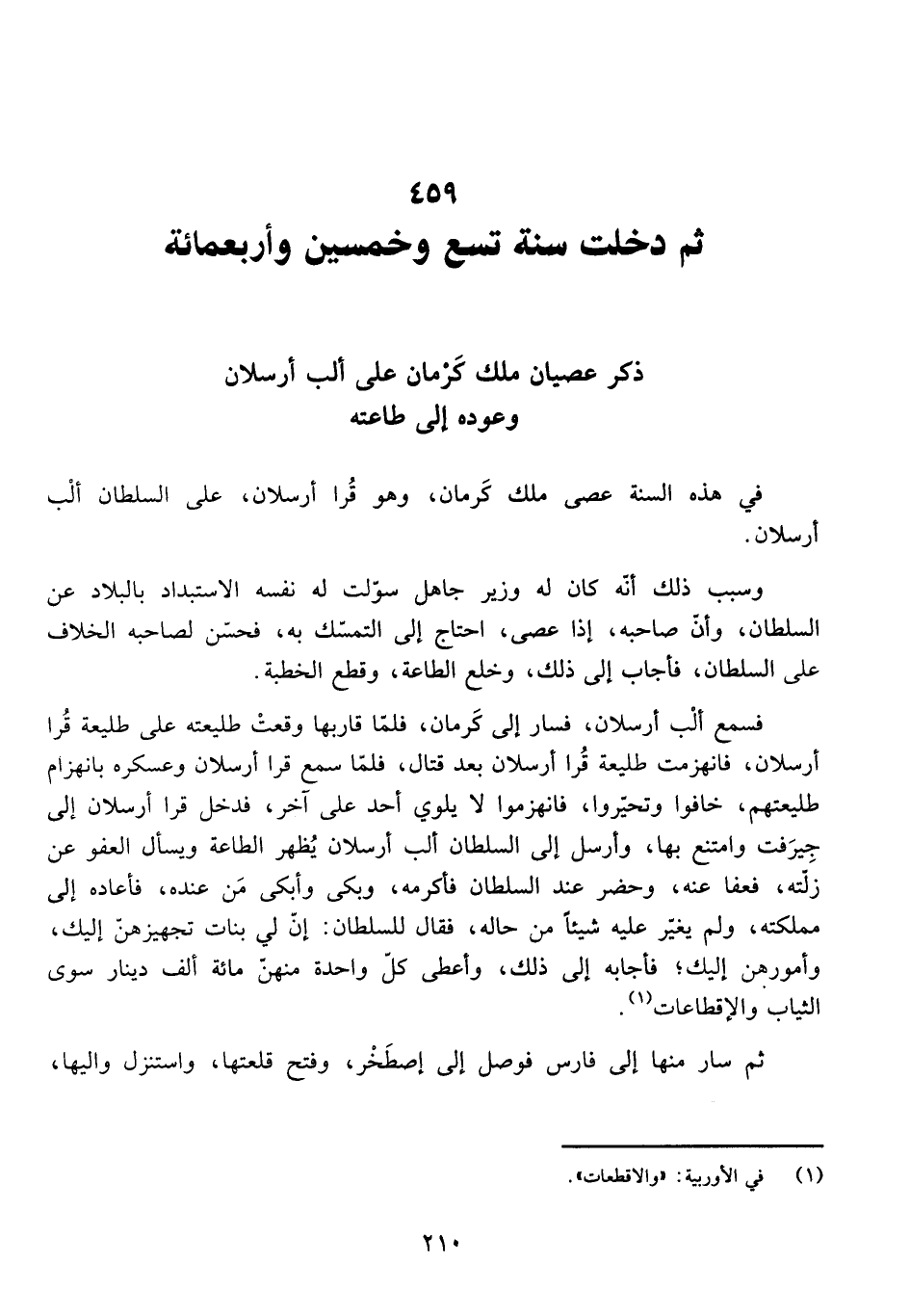 ذِكْرُ عِصْيَانِ مَلِكِ كَرْمَانَ عَلَى أَلْب أَرْسَلَانَ وَعَوْدِهِ إِلَى طَاعَتِهِ.