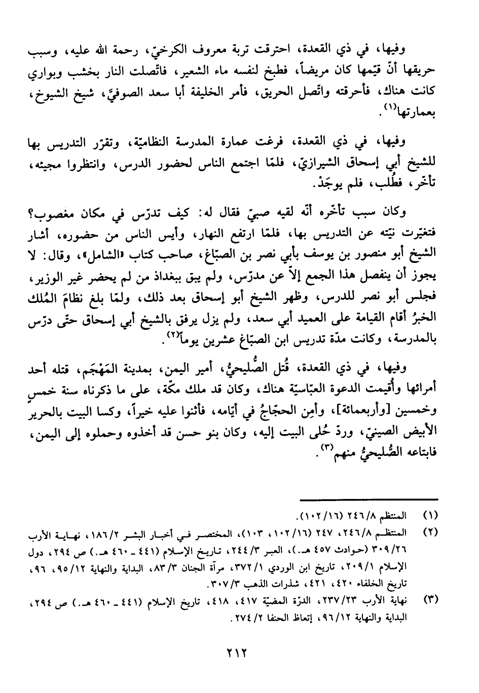 وَكَانَ سَبَبُ تَأَخُّرِهِ أَنَّهُ لَقِيَهُ صَبِيٌّ، فَقَالَ لَهُ: كَيْفَ تُدَرِّسُ فِي مَكَانٍ مَغْصُوبٍ؟ فَتَغَيَّرَتْ نِيَّتُهُ عَنِ التَّدْرِيسِ بِهَا، فَلَمَّا ارْتَفَعَ النَّهَارُ، وَأُيِسَ مِنْ حُضُورِهِ، أَشَارَ الشَّيْخُ أَبُو مَنْصُورِ بْنُ يُوسُفَ بِأَبِي نَصْرٍ الصَّبَّاغِ، صَاحِبِ كِتَابِ الشَّامِلِ، وَقَالَ: لَا يَجُوزُ أَنْ يَنْفَصِلَ هَذَا الْجَمْعُ إِلَّا عَنْ مُدَرِّسٍ، وَلَمْ يَبْقَ بِبَغْدَاذَ مَنْ لَمْ يَحْضُرْ غَيْرَ الْوَزِيرِ، فَجَلَسَ أَبُو نَصْرٍ لِلدَّرْسِ، وَظَهَرَ الشَّيْخُ أَبُو إِسْحَاقَ بَعْدَ ذَلِكَ، وَلَمَّا بَلَغَ نِظَامَ الْمُلْكِ الْخَبَرُ أَقَامَ الْقِيَامَةَ عَلَى الْعَمِيدِ أَبِي سَعْدٍ، وَلَمْ يَزَلْ يَرْفُقُ بِالشَّيْخِ أَبِي إِسْحَاقَ حَتَّى دَرَّسَ بِالْمَدْرَسَةِ، وَكَانَتْ مُدَّةُ تَدْرِيسِ ابْنِ الصَّبَّاغِ عِشْرِينَ يَوْمًا. وَفِيهَا، فِي ذِي الْقَعْدَةِ، قُتِلَ الصُّلَيْحِيُّ، أَمِيرُ الْيَمَنِ، بِمَدِينَةِ الْمَهْجَمِ، قَتَلَهُ أَحَدُ أُمَرَائِهَا وَأُقِيمَتِ الدَّعْوَةُ الْعَبَّاسِيَّةُ هُنَاكَ، وَكَانَ قَدْ مَلَكَ مَكَّةَ، عَلَى مَا ذَكَرْنَاهُ سَنَةَ خَمْسٍ وَأَرْبَعِمِائَةٍ، وَأَمِنَ الْحُجَّاجُ فِي أَيَّامِهِ، فَأَثْنَوْا عَلَيْهِ خَيْرًا، وَكَسَا الْبَيْتَ بِالْحَرِيرِ الْأَبْيَضِ الصِّينِيِّ، وَرَدَّ حُلِّيَ الْبَيْتِ إِلَيْهِ، وَكَانَ بَنُو حَسَنٍ قَدْ أَخَذُوهُ وَحَمَلُوهُ إِلَى الْيَمَنِ، فَابْتَاعَهُ الصُّلَيْحِيُّ مِنْهُمْ.