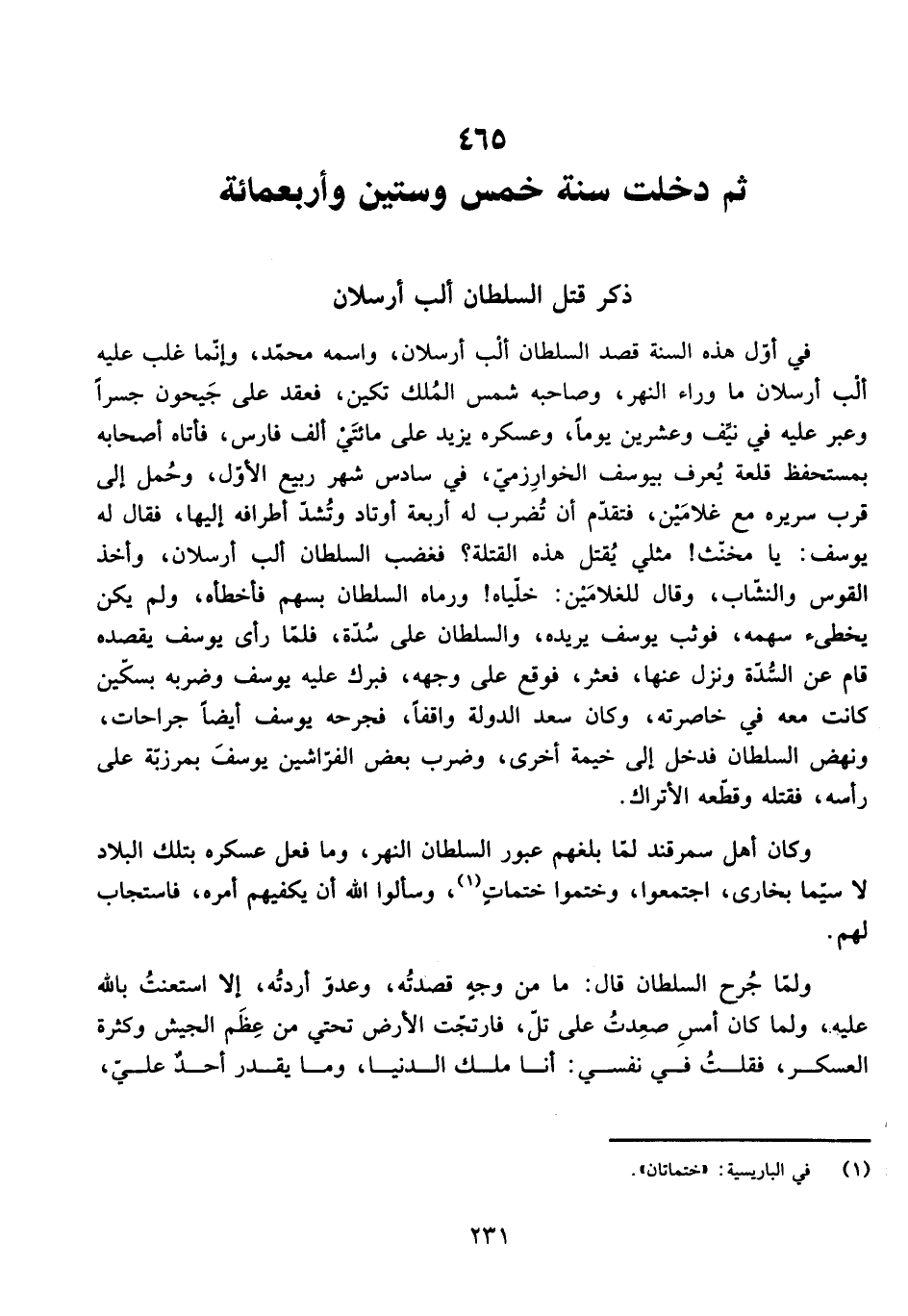 فِي أَوَّلِ هَذِهِ السَّنَةِ قَصَدَ السُّلْطَانُ أَلْب أَرْسَلَانَ، وَاسْمُهُ مُحَمَّدٌ، وَإِنَّمَا غَلَبَ عَلَيْهِ أَلْب أَرْسَلَانَ مَا وَرَاءَ النَّهْرِ، وَصَاحِبُهُ شَمْسُ الْمُلْكِ تِكِينَ، فَعَقَدَ عَلَى جَيْحُونَ جِسْرًا وَعَبَرَ عَلَيْهِ فِي نَيِّفٍ وَعِشْرِينَ يَوْمًا، وَعَسْكَرُهُ يَزِيدُ عَلَى مِائَتَيْ أَلْفِ فَارِسٍ، فَأَتَاهُ أَصْحَابُهُ بِمُسْتَحْفِظِ قَلْعَةٍ يُعْرَفُ بِيُوسُفَ الْخُوَارِزْمِيِّ، فِي سَادِسِ شَهْرِ رَبِيعٍ الْأَوَّلِ، وَحُمِلَ إِلَى قُرْبِ سَرِيرِهِ مَعَ غُلَامَيْنِ، فَتَقَدَّمَ أَنْ تُضْرَبَ لَهُ أَرْبَعَةُ أَوْتَادٍ وَتُشَدَّ أَطْرَافُهُ إِلَيْهَا، فَقَالَ لَهُ يُوسُفُ: يَا مُخَنَّثُ! مِثْلِي يُقْتَلُ هَذِهِ الْقِتْلَةَ؟ فَغَضِبَ السُّلْطَانُ أَلْب أَرْسَلَانَ، وَأَخَذَ الْقَوْسَ وَالنِّشَابَ، وَقَالَ لِلْغُلَامَيْنِ: خَلِّيَاهُ! وَرَمَاهُ السُّلْطَانُ بِسَهْمٍ فَأَخْطَأَهُ، وَلَمْ يَكُنْ يُخْطِئُ سَهْمُهُ، فَوَثَبَ يُوسُفُ يُرِيدُهُ، وَالسُّلْطَانُ عَلَى سُدَّةٍ، فَلَمَّا رَأَى يُوسُفَ يَقْصِدُهُ قَامَ عَنِ السُّدَّةِ وَنَزَلَ عَنْهَا، فَعَثَرَ، فَوَقَعَ عَلَى وَجْهِهِ، فَبَرَكَ عَلَيْهِ يُوسُفُ وَضَرَبَهُ بِسِكِّينٍ كَانَتْ مَعَهُ فِي خَاصِرَتِهِ، وَكَانَ سَعْدُ الدَّوْلَةِ وَاقِفًا، فَجَرَحَهُ يُوسُفُ أَيْضًا جِرَاحَاتٍ، وَنَهَضَ السُّلْطَانُ إِلَى خَيْمَةٍ أُخْرَى، وَضَرَبَ بَعْضُ الْفَرَّاشِينَ يُوسُفَ بِمِرْزَبَةٍ عَلَى رَأْسِهِ فَقَتَلَهُ، وَقَطَّعَهُ الْأَتْرَاكُ.