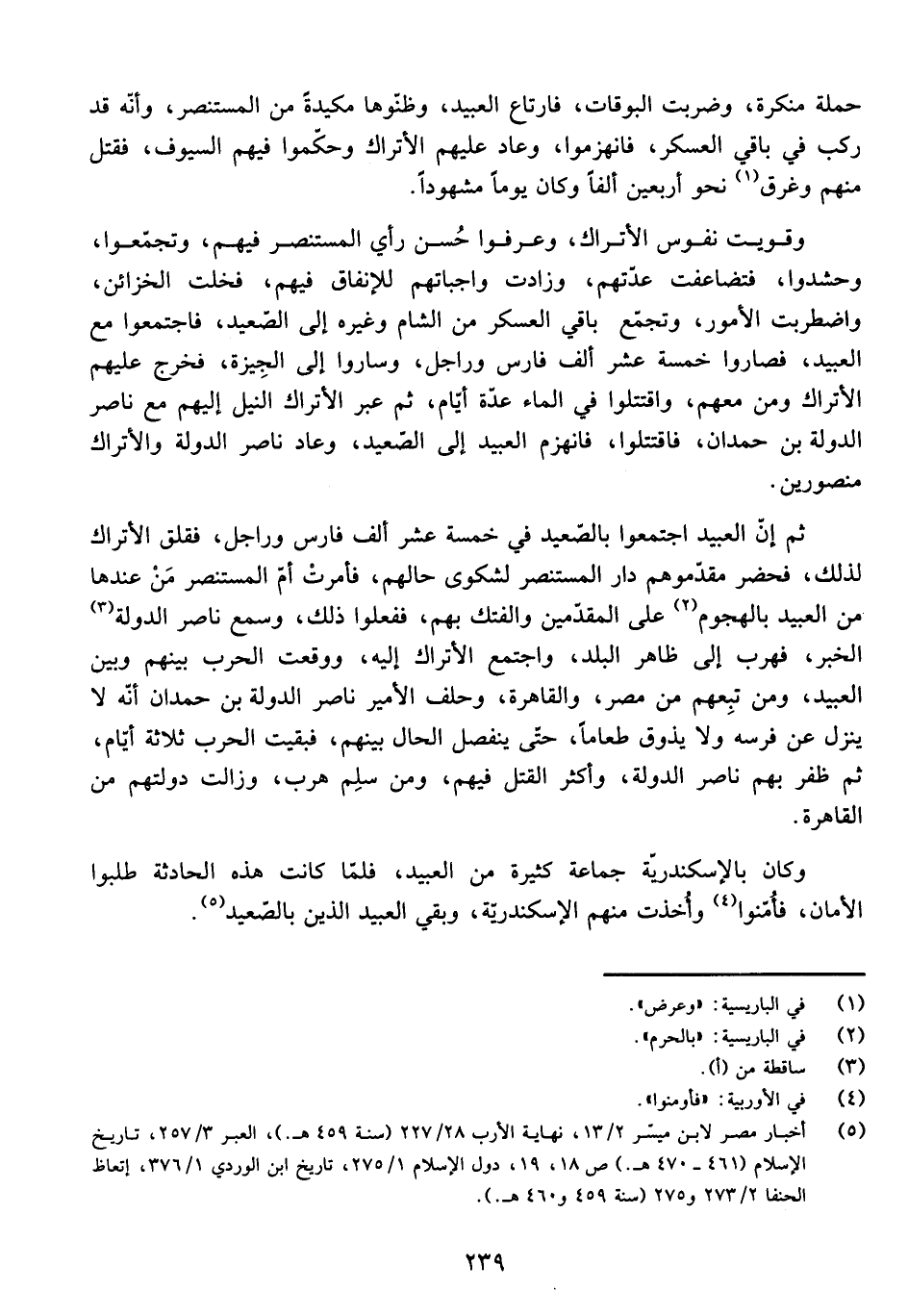 ثُمَّ إِنَّ الْعَبِيدَ اجْتَمَعُوا بِالصَّعِيدِ فِي خَمْسَةَ عَشَرَ أَلْفَ فَارِسٍ وَرَاجِلٍ، فَقَلِقَ الْأَتْرَاكُ لِذَلِكَ، فَحَضَرَ مُقَدَّمُوهُمْ دَارَ الْمُسْتَنْصِرِ لِشَكْوَى حَالِهِمْ، فَأَمَرَتْ أُمُّ الْمُسْتَنْصِرِ مَنْ عِنْدِهَا مِنَ الْعَبِيدِ بِالْهُجُومِ عَلَى الْمُقَدَّمِينَ وَالْفَتْكِ بِهِمْ، فَفَعَلُوا ذَلِكَ، وَسَمِعَ نَاصِرُ الدَّوْلَةِ الْخَبَرَ، فَهَرَبَ إِلَى ظَاهِرِ الْبَلَدِ، وَاجْتَمَعَ الْأَتْرَاكُ إِلَيْهِ وَوَقَعَتِ الْحَرْبُ بَيْنَهُمْ وَبَيْنَ الْعَبِيدِ، وَمَنْ تَبِعَهُمْ مِنْ مِصْرَ، وَالْقَاهِرَةِ، وَحَلَفَ الْأَمِيرُ نَاصِرُ الدَّوْلَةِ بْنُ حَمْدَانَ أَنَّهُ لَا يَنْزِلُ عَنْ فَرَسِهِ وَلَا يَذُوقُ طَعَامًا حَتَّى يَنْفَصِلَ الْحَالُ بَيْنَهُمْ، فَبَقِيَتِ الْحَرْبُ ثَلَاثَ أَيَّامٍ، ثُمَّ ظَفِرَ بِهِمْ نَاصِرُ الدَّوْلَةِ، وَأَكْثَرَ الْقَتْلَ فِيهِمْ، وَمَنْ سَلِمَ هَرَبَ، وَزَالَتْ دَوْلَتُهُمْ مِنَ الْقَاهِرَةِ.