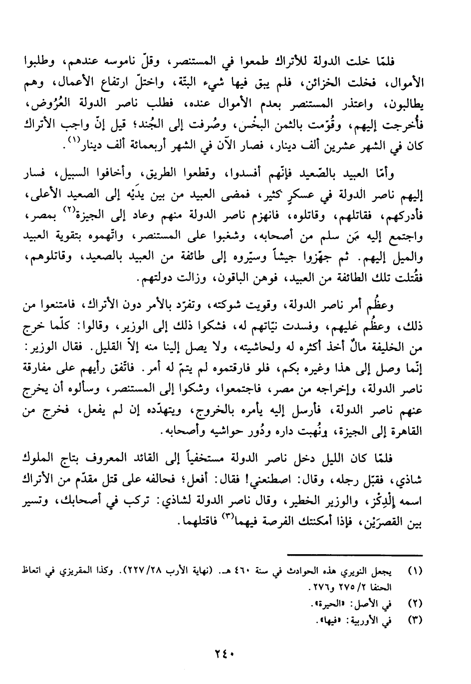 وَأَمَّا الْعَبِيدُ بِالصَّعِيدِ فَإِنَّهُمْ أَفْسَدُوا، وَقَطَعُوا الطَّرِيقَ، وَأَخَافُوا السَّبِيلَ، فَسَارَ إِلَيْهِمْ نَاصِرُ الدَّوْلَةِ فِي عَسْكَرٍ كَثِيرٍ، فَمَضَى الْعَبِيدُ مِنْ بَيْنِ يَدَيْهِ إِلَى الصَّعِيدِ الْأَعْلَى، فَأَدْرَكَهُمْ، فَقَاتَلَهُمْ، وَقَاتَلُوهُ، فَانْهَزَمَ نَاصِرُ الدَّوْلَةِ مِنْهُمْ وَعَادَ إِلَى الْجِيزَةِ بِمِصْرَ، وَاجْتَمَعَ إِلَيْهِ مَنْ سَلِمَ مِنْ أَصْحَابِهِ، وَشَغَبُوا عَلَى الْمُسْتَنْصِرِ. وَاتَّهَمُوهُ بِتَقْوِيَةِ الْعَبِيدِ وَالْمِيلِ إِلَيْهِمْ، ثُمَّ جَهَّزُوا جَيْشًا وَسَيَّرُوهُ إِلَى طَائِفَةٍ مِنَ الْعَبِيدِ، فَوَهَنَ الْبَاقُونَ، وَزَالَتْ دَوْلَتُهُمْ.