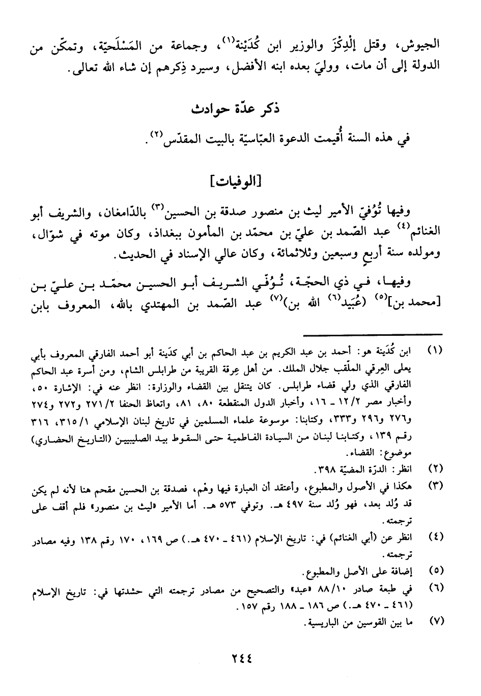 وَفِيهَا تُوُفِّيَ الْأَمِيرُ لَيْثُ بْنُ مَنْصُورٍ صَدَقَةَ بْنِ الْحُسَيْنِ بِالدَّامَغَانِ، وَالشَّرِيفُ أَبُو الْغَنَائِمِ عَبْدُ الصَّمَدِ بْنُ عَلِيِّ بْنِ مُحَمَّدِ بْنِ الْمَأْمُونِ بِبَغْدَاذَ، وَكَانَ مَوْتُهُ فِي شَوَّالٍ، وَمَوْلِدُهُ سَنَةَ أَرْبَعٍ وَسَبْعِينَ وَثَلَاثِمِائَةٍ، وَكَانَ عَالِيَ الْإِسْنَادِ فِي الْحَدِيثِ.