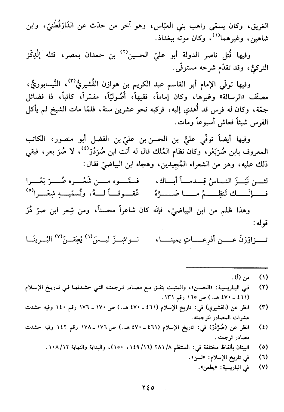 وَفِيهَا تُوُفِّيَ الْإِمَامُ أَبُو الْقَاسِمِ عَبْدُ الْكَرِيمِ بْنُ هَوَازِنَ الْقُشَيْرِيُّ، النَّيْسَابُورِيُّ، مُصَنِّفُ " الرِّسَالَةِ " وَغَيْرِهَا، وَكَانَ إِمَامًا، فَقِيهًا، أُصُولِيًّا، مُفَسِّرًا، كَاتِبًا، ذَا فَضَائِلَ جَمَّةٍ، وَكَانَ لَهُ فَرَسٌ قَدْ أُهْدِيَ إِلَيْهِ، فَرَكِبَهُ نَحْوَ عِشْرِينَ سَنَةً، فَلَمَّا مَاتَ الشَّيْخُ لَمْ يَأْكُلِ الْفَرَسُ شَيْئًا فَعَاشَ أُسْبُوعًا وَمَاتَ.