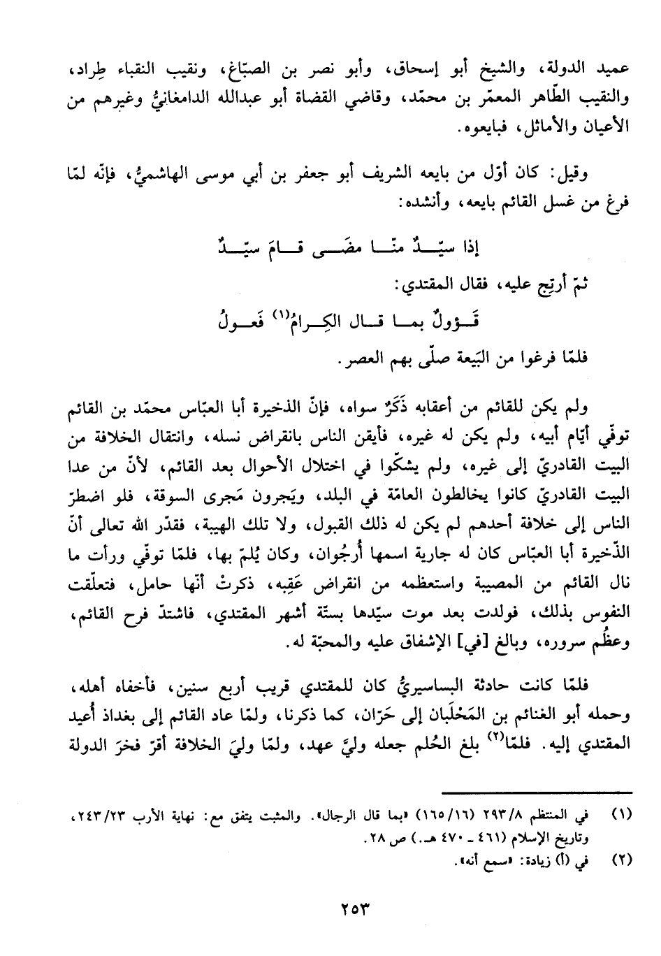 وَقِيلَ: كَانَ أَوَّلُ مَنْ بَايَعَهُ الشَّرِيفُ أَبُو جَعْفَرِ بْنُ أَبِي مُوسَى الْهَاشِمِيُّ، فَإِنَّهُ لَمَّا فَرَغَ مِنْ غَسْلِ الْقَائِمِ بَايَعَهُ، وَأَنْشَدَهُ: