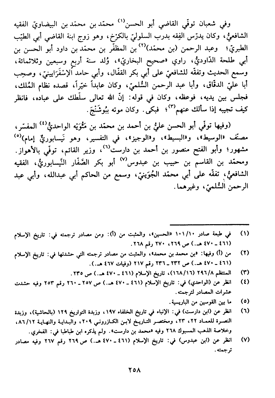 (وَفِيهَا تُوُفِّيَ أَبُو الْحَسَنِ عَلِيُّ بْنُ أَحْمَدَ بْنِ مُحَمَّدِ بْنِ مَتُّوَيْهِ الْوَاحِدِيُّ الْمُفَسِّرُ، مُصَنِّفُ " الْوَسِيطِ "، " وَالْبَسِيطِ "، " وَالْوَجِيزِ "، فِي التَّفْسِيرِ، وَهُوَ نَيْسَابُورِيٌّ، إِمَامٌ) مَشْهُورٌ، وَأَبُو الْفَتْحِ مَنْصُورُ بْنُ أَحْمَدَ بْنِ دَارَسَتْ، وَزِيرُ الْقَائِمِ، تُوُفِّيَ بِالْأَهْوَازِ، وَمُحَمَّدُ بْنُ الْقَاسِمِ بْنِ حَبِيبِ بْنِ عَبْدُوسٍ أَبُو بَكْرٍ الصَّفَّارُ النَّيْسَابُورِيُّ، الْفَقِيهُ الشَّافِعِيُّ، تَفَقَّهَ عَلَى أَبِي مُحَمَّدٍ الْجُوَيْنِيِّ، وَسَمِعَ مِنَ الْحَاكِمِ أَبِي عَبْدِ اللَّهِ وَأَبِي عَبْدِ الرَّحْمَنِ السُّلَمِيِّ وَغَيْرِهِمَا.