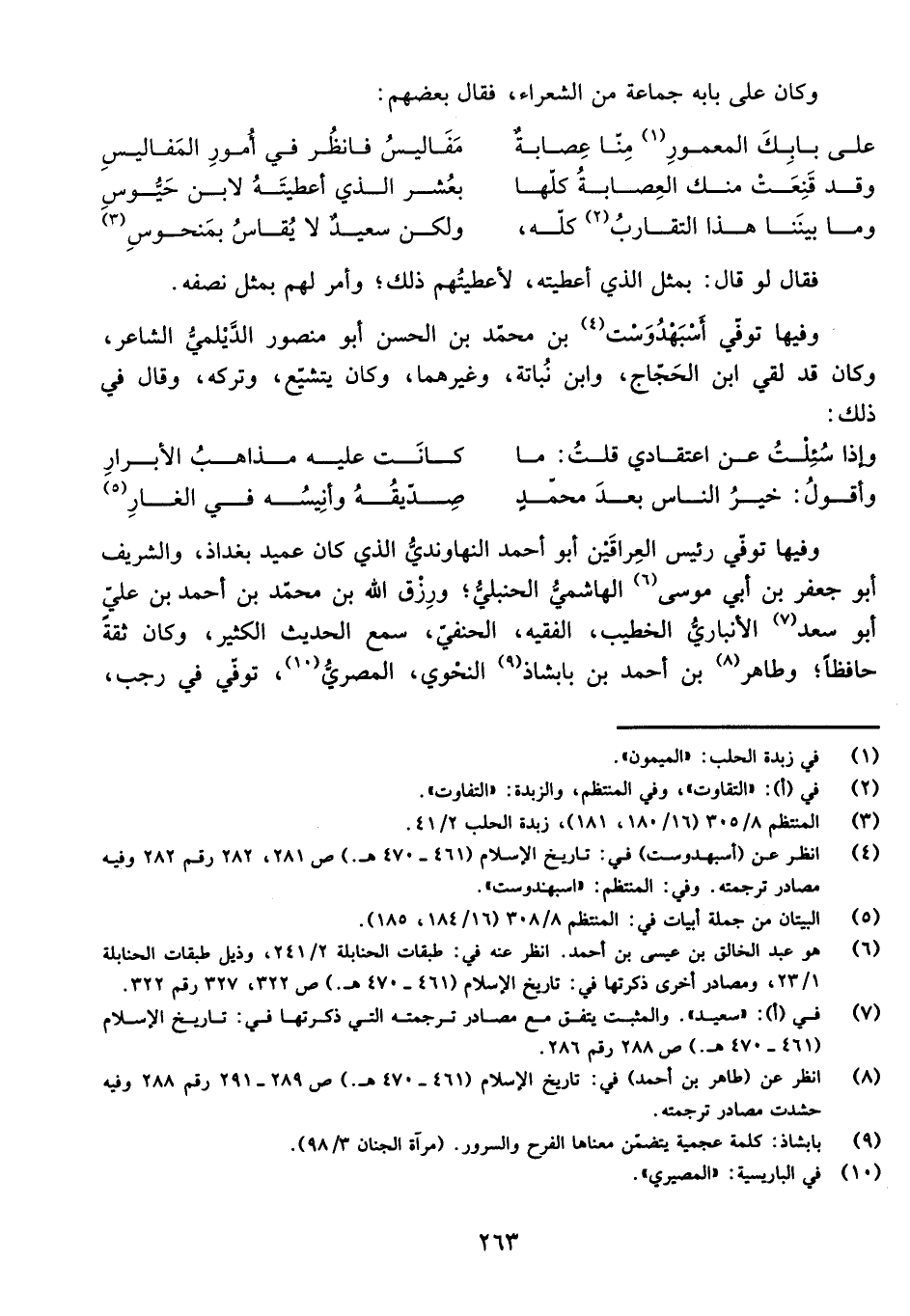 وَفِيهَا تُوُفِّيَ أَسْبَهْدُوَسْت بْنُ مُحَمَّدِ بْنِ الْحَسَنِ أَبُو مَنْصُورٍ الدَّيْلَمِيُّ الشَّاعِرُ، وَكَانَ قَدْ لَقِيَ ابْنَ الْحَجَّاجِ، وَابْنَ نُبَاتَةَ وَغَيْرَهُمَا وَكَانَ يَتَشَيَّعُ، وَتَرَكَهُ وَقَالَ فِي ذَلِكَ: