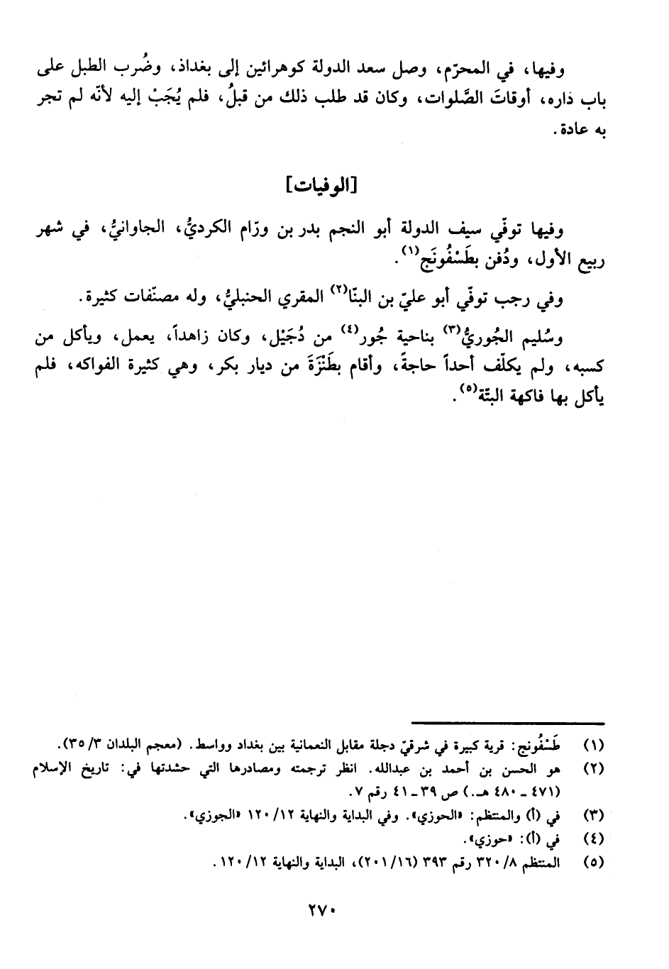 وَفِيهَا تُوُفِّيَ سَيْفُ الدَّوْلَةِ أَبُو النَّجْمِ بَدْرُ بْنُ وَرَّامَ الْكُرْدِيُّ، الْجَاوَانِيُّ، فِي شَهْرِ رَبِيعٍ الْأَوَّلِ، وَدُفِنَ بِطَسْفُونَجْ.