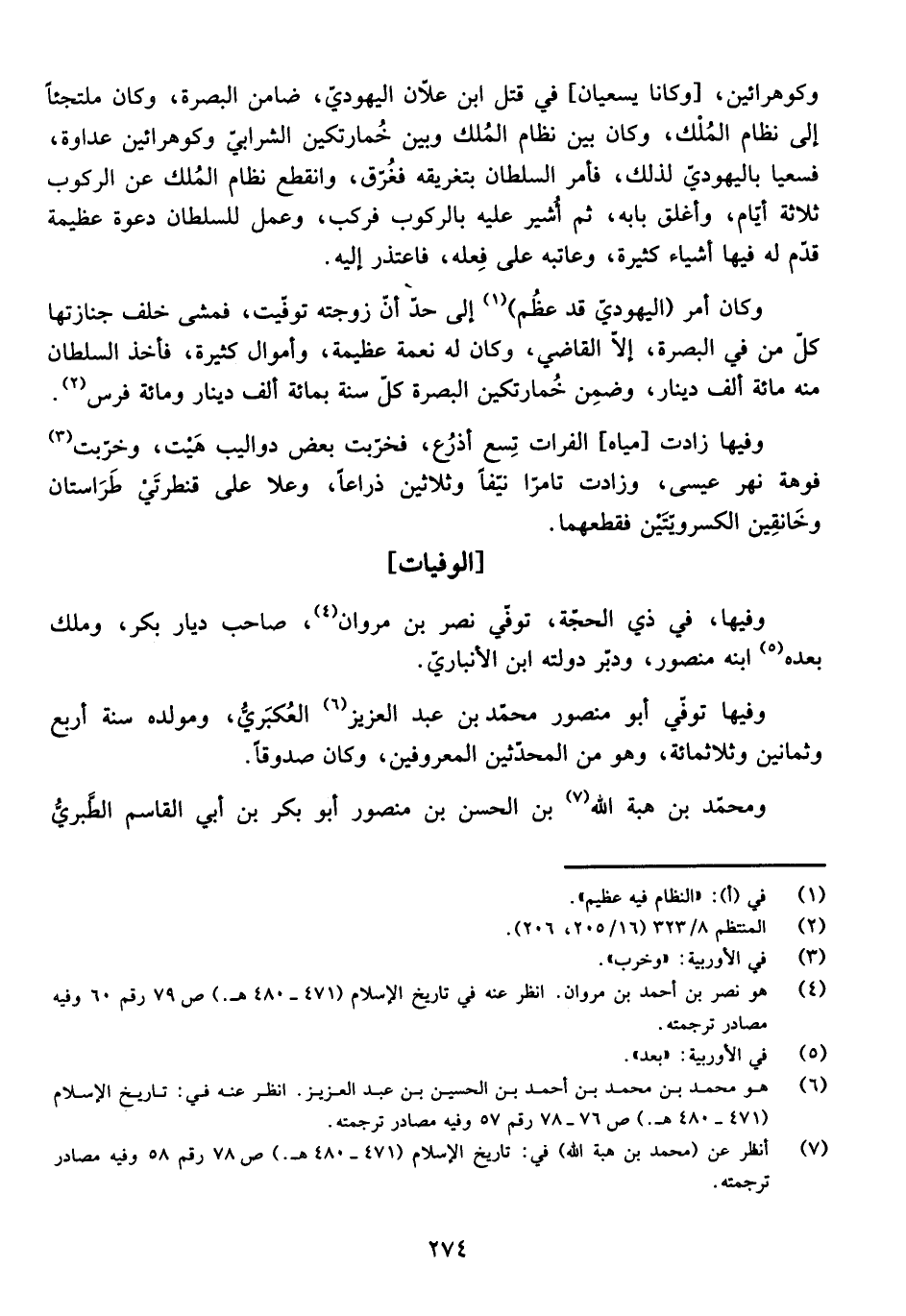 وَفِيهَا، فِي ذِي الْحِجَّةِ، تُوُفِّيَ نَصْرُ بْنُ مَرْوَانَ، صَاحِبُ دِيَارِ بَكْرٍ، وَمَلَكَ بَعْدَهُ ابْنُهُ مَنْصُورٌ، وَدَبَّرَ دَوْلَتَهَ ابْنُ الْأَنْبَارِيِّ.