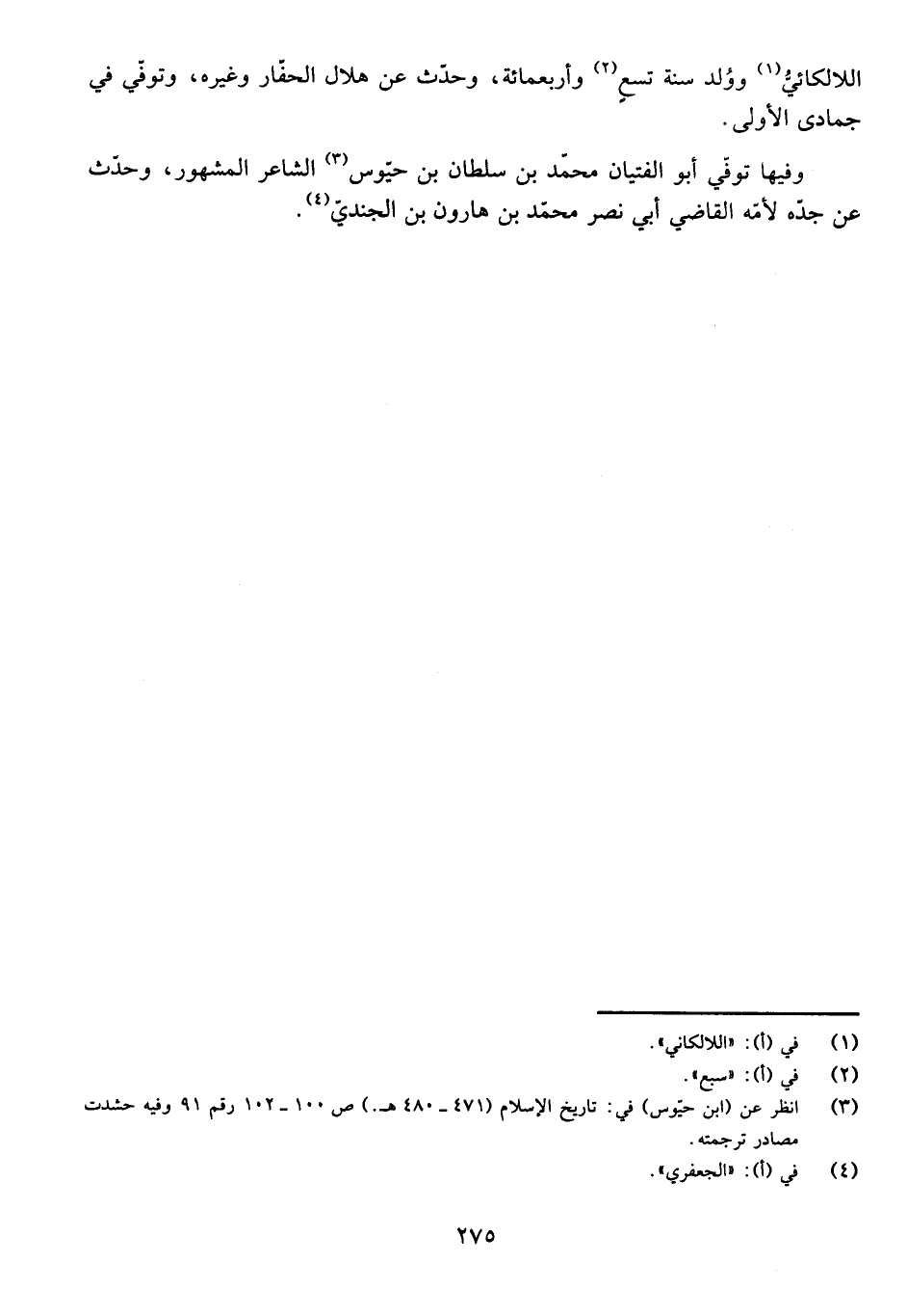 اللَّالَكَائِيُّ وَوُلِدَ سَنَةَ تِسْعٍ وَأَرْبَعِمِائَةٍ، وَحَدَّثَ عَنْ هِلَالٍ الْحَفَّارِ وَغَيْرِهِ، وَتُوُفِّيَ فِي جُمَادَى الْأُولَى.