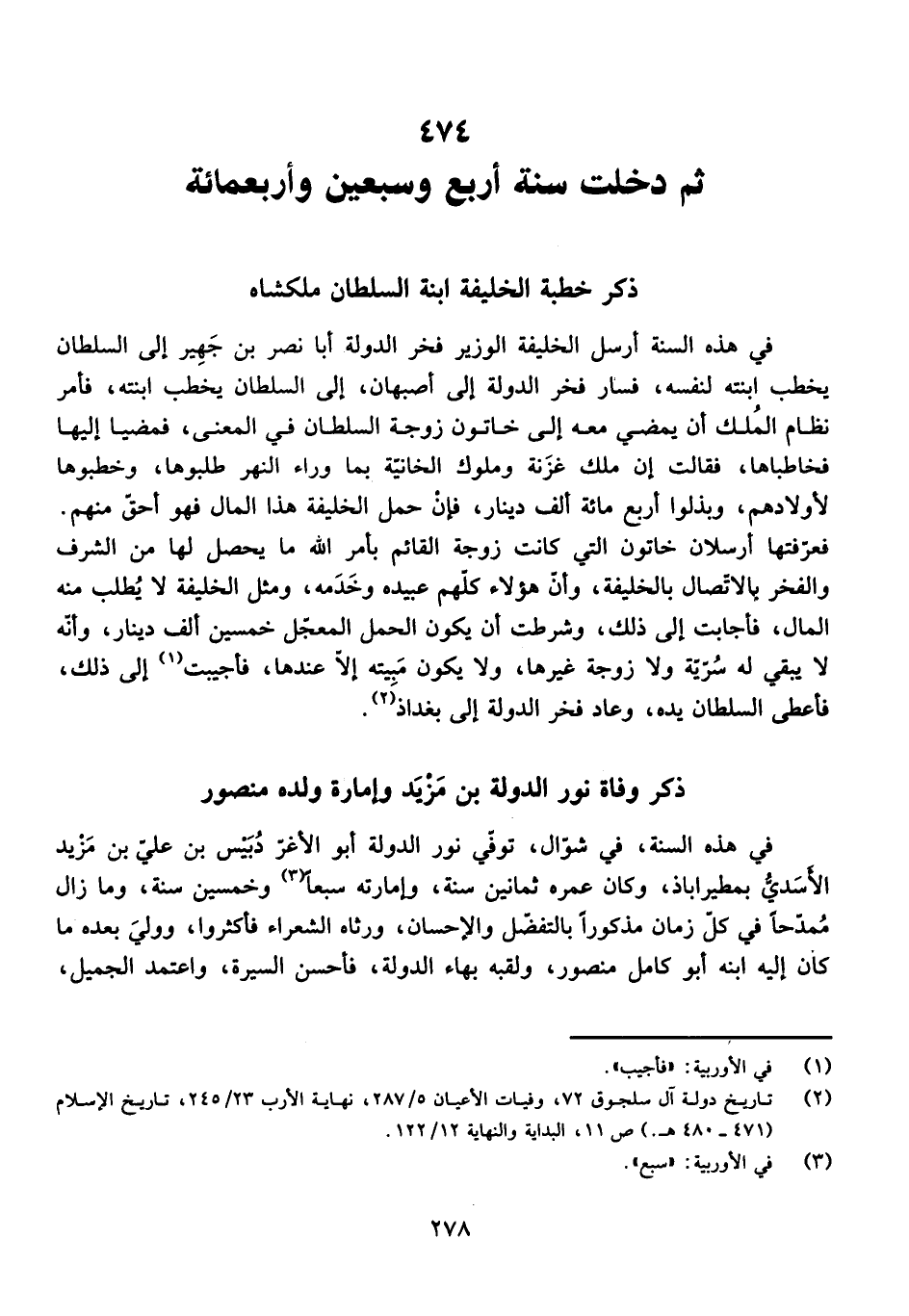 [ثُمَّ دَخَلَتْ سَنَةُ أَرْبَعٍ وَسَبْعِينَ وَأَرْبَعِمِائَةٍ.]