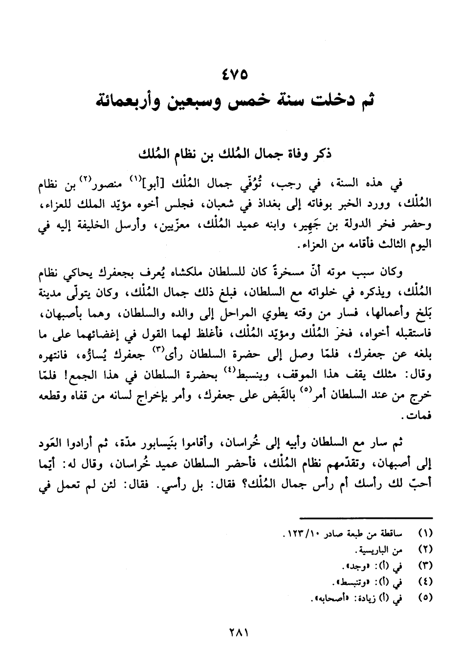 فِي هَذِهِ السَّنَةِ، فِي رَجَبٍ، تُوُفِّيَ جَمَالُ الْمُلْكِ [أَبُو] مَنْصُورِ بْنُ نِظَامِ الْمُلْكِ، وَوَرَدَ الْخَبَرُ بِوَفَاتِهِ إِلَى بَغْدَاذَ فِي شَعْبَانَ، فَجَلَسَ أَخُوهُ مُؤَيَّدُ الْمُلْكِ لِلْعَزَاءِ، وَحَضَرَ فَخْرُ الدَّوْلَةِ بْنُ جَهِيرٍ، وَابْنُهُ عَمِيدُ الْمُلْكِ، مُعَزِّيَيْنِ، وَأَرْسَلَ الْخَلِيفَةُ إِلَيْهِ فِي الْيَوْمِ الثَّالِثِ فَأَقَامَهُ مِنَ الْعَزَاءِ.