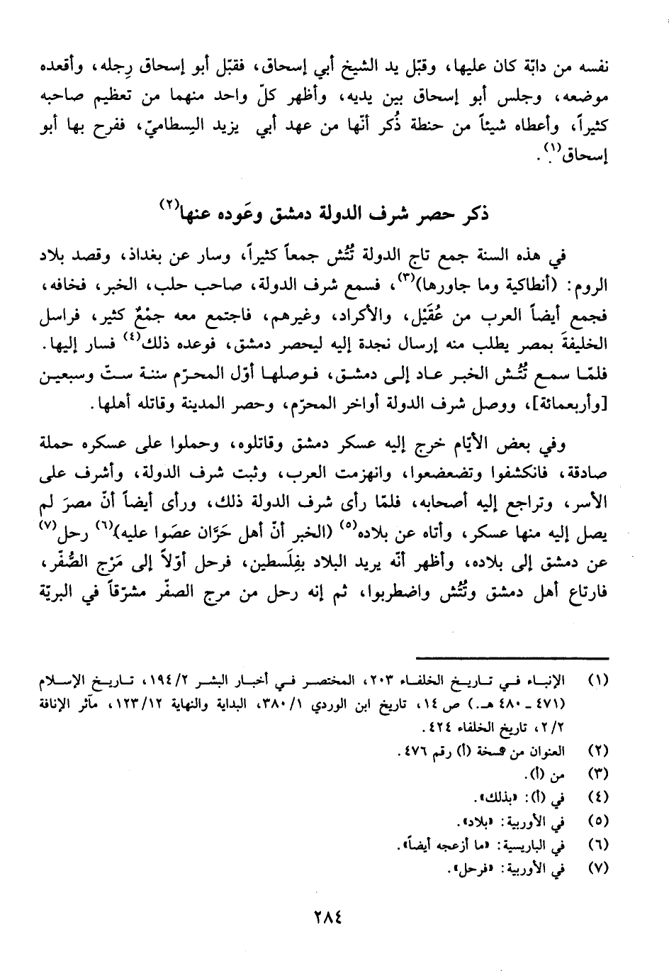 فِي هَذِهِ السَّنَةِ جَمَعَ تَاجُ الدَّوْلَةِ تُتُشْ جَمْعًا كَثِيرًا، وَسَارَ عَنْ بَغْدَاذَ، وَقَصَدَ بِلَادَ الرُّومِ: (أَنْطَاكِيَةَ وَمَا جَاوَرَهَا) ، فَسَمِعَ شَرَفُ الدَّوْلَةِ، صَاحِبُ حَلَبَ، الْخَبَرَ، فَخَافَهُ، فَجَمَعَ أَيْضًا الْعَرَبَ مِنْ عُقَيْلٍ، وَالْأَكْرَادَ، وَغَيْرَهُمْ، فَاجْتَمَعَ مَعَهُ جَمْعٌ كَثِيرٌ، فَرَاسَلَ الْخَلِيفَةَ بِمِصْرَ يَطْلُبُ مِنْهُ إِرْسَالَ نَجْدَةٍ إِلَيْهِ لِيَحْصُرَ دِمَشْقَ، فَوَعَدَهُ ذَلِكَ فَسَارَ إِلَيْهَا، فَلَمَّا سَمِعَ تُتُش الْخَبَرَ عَادَ إِلَى دِمَشْقَ، فَوَصَلَهَا أَوَّلَ الْمُحَرَّمِ سَنَةَ سِتٍّ وَسَبْعِينَ [وَأَرْبَعِمِائَةٍ] ، وَوَصَلَ شَرَفُ الدَّوْلَةِ أَوَاخِرَ الْمُحَرَّمِ، وَحَصَرَ الْمَدِينَةَ وَقَاتَلَهُ أَهْلُهَا.