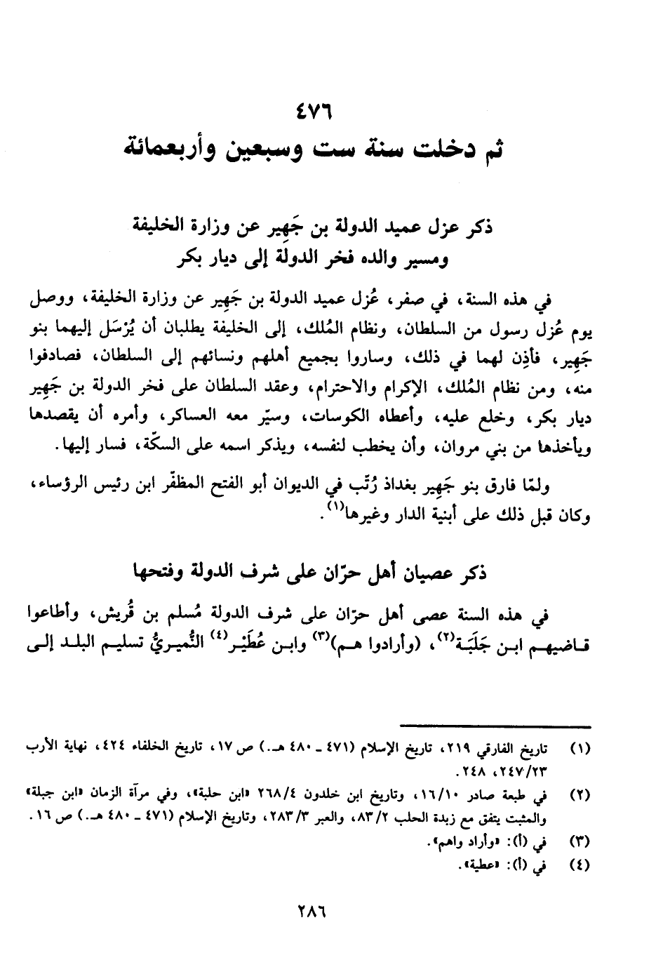 ثُمَّ دَخَلَتْ سَنَةُ سِتٍّ وَسَبْعِينَ وَأَرْبَعِمِائَةٍ.