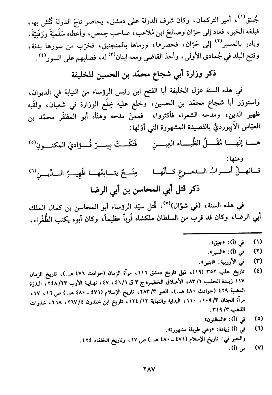 فِي هَذِهِ السَّنَةِ، (فِي شَوَّالٍ) ، قُتِلَ سَيِّدُ الرُّؤَسَاءِ أَبُو الْمَحَاسِنِ بْنُ كَمَالِ الْمُلْكِ أَبِي الرِّضَا، وَكَانَ قَدْ قَرُبَ مِنَ السُّلْطَانِ مَلِكْشَاهْ قُرْبًا عَظِيمًا، وَكَانَ أَبُوهُ يَكْتُبُ الطُّغْرَاءَ
