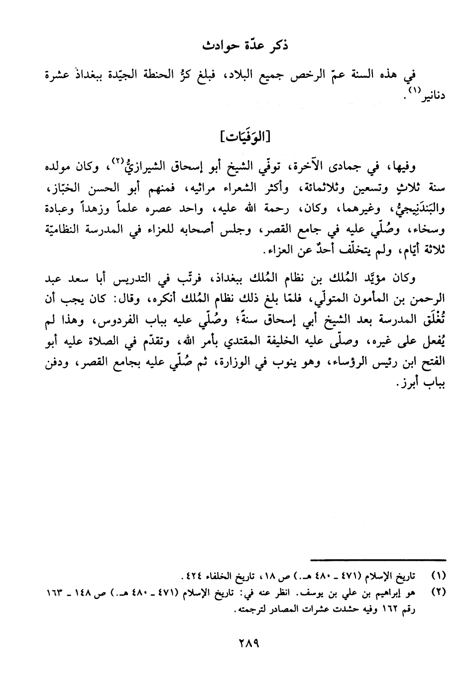 وَفِيهَا، فِي جُمَادَى الْآخِرَةِ، تُوُفِّيَ الشَّيْخُ أَبُو إِسْحَاقَ الشِّيرَازِيُّ، وَكَانَ مَوْلِدُهُ سَنَةَ ثَلَاثٍ وَتِسْعِينَ وَثَلَاثِمِائَةٍ، وَأَكْثَرَ الشُّعَرَاءُ مَرَاثِيَهُ، فَمِنْهُمْ أَبُو الْحَسَنِ الْخَبَّازُ، وَالْبَنْدَنِيجِيُّ، وَغَيْرُهُمَا، وَكَانَ رَحْمَةُ اللَّهِ عَلَيْهِ، وَاحِدَ عَصْرِهِ عِلْمًا وَزُهْدًا وَعِبَادَةً وَسَخَاءً، وَصُلِّيَ عَلَيْهِ فِي جَامِعِ الْقَصْرِ، وَجَلَسَ أَصْحَابُهُ لِلْعَزَاءِ فِي الْمَدْرَسَةِ النِّظَامِيَّةِ ثَلَاثَةَ أَيَّامٍ، وَلَمْ يَتَخَلَّفْ أَحَدٌ عَنِ الْعَزَاءِ.