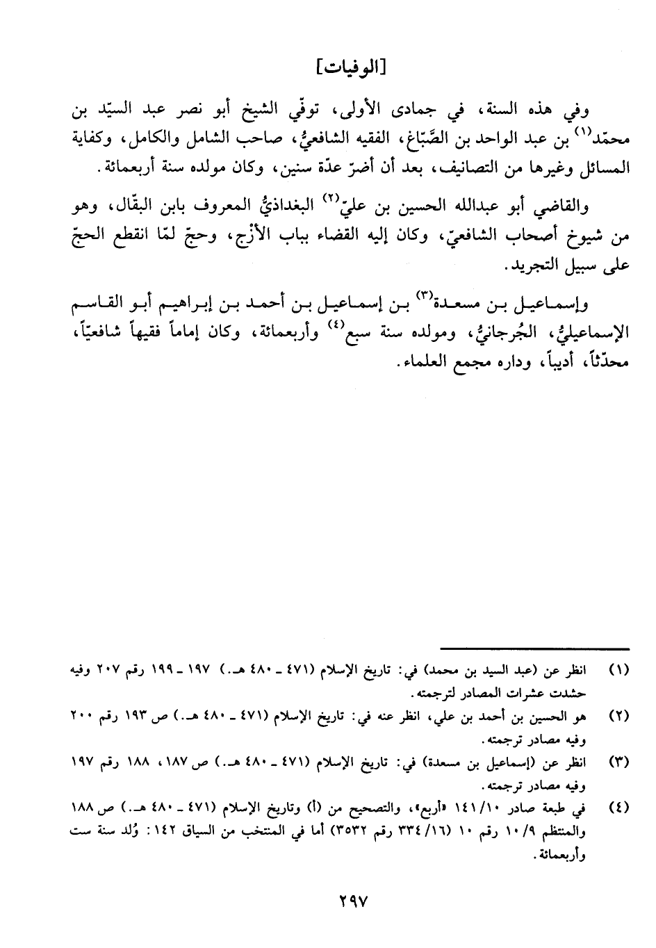 وَفِي هَذِهِ السَّنَةِ، فِي جُمَادَى الْأُولَى، تُوُفِّيَ الشَّيْخُ أَبُو نَصْرٍ عَبْدُ السَّيِّدِ بْنُ مُحَمَّدِ بْنِ عَبْدِ الْوَاحِدِ بْنِ الصَّبَّاغِ، الْفَقِيهُ الشَّافِعِيُّ، صَاحِبُ الشَّامِلِ وَالْكَامِلِ، وَكِفَايَةِ الْمَسَائِلِ وَغَيْرِهَا مِنَ التَّصَانِيفِ، بَعْدَ أَنْ أَضَرَّ عِدَّةَ سِنِينَ، وَكَانَ مَوْلِدُهُ سَنَةَ أَرْبَعِمِائَةٍ.