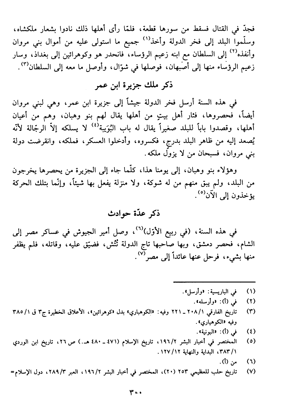 فِي هَذِهِ السَّنَةِ أَرْسَلَ فَخْرُ الدَّوْلَةِ جَيْشًا إِلَى جَزِيرَةِ ابْنِ عُمَرَ، وَهِيَ لِبَنِي مَرْوَانَ أَيْضًا، فَحَصَرُوهَا، فَثَارَ أَهْلُ بَيْتٍ مِنْ أَهْلِهَا يُقَالُ لَهُمْ بَنُو وَهْبَانَ، وَهُمْ مِنْ أَعْيَانِ أَهْلِهَا، وَقَصَدُوا بَابًا لِلْبَلَدِ صَغِيرًا يُقَالُ لَهُ بَابُ الْبُوَيْبَةِ لَا يَسْلُكُهُ إِلَّا الرَّجَّالَةُ لِأَنَّهُ يُصْعَدُ إِلَيْهِ مِنْ ظَاهِرِ الْبَلَدِ بِدَرَجٍ، فَكَسَرُوهُ، وَأَدْخَلُوا الْعَسْكَرَ، فَمَلَكَهُ، وَانْقَرَضَتْ دَوْلَةُ بَنِي مَرْوَانَ، فَسُبْحَانَ مَنْ لَا يَزُولُ مُلْكُهُ.