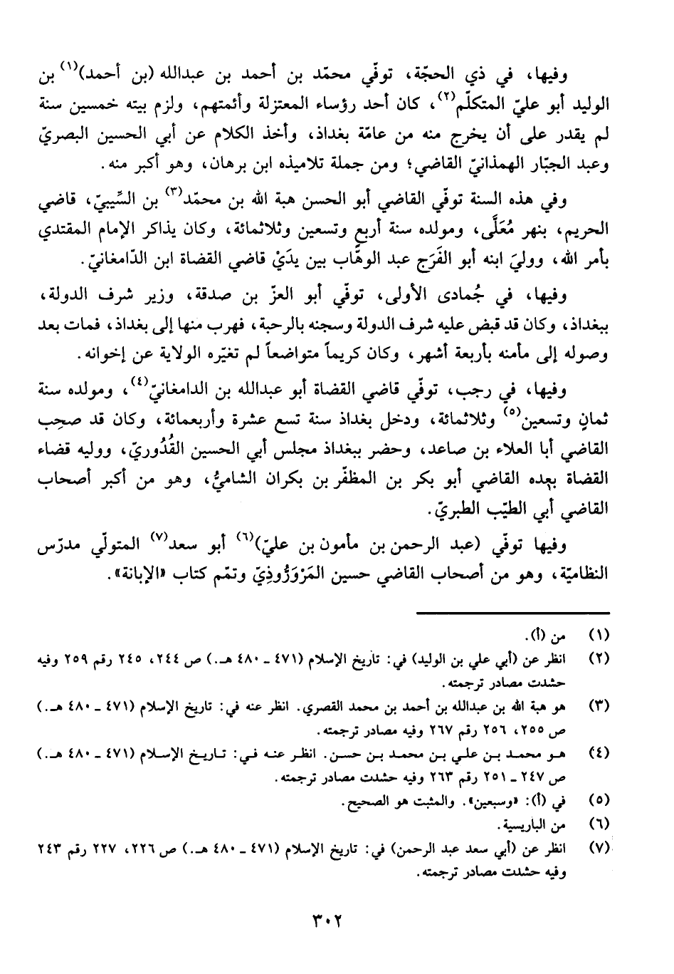 وَفِي هَذِهِ السَّنَةِ تُوُفِّيَ الْقَاضِي أَبُو الْحَسَنِ هِبَةُ اللَّهِ مُحَمَّدُ بْنُ السِّيبِيِّ، قَاضِي الْحَرِيمِ، بِنَهْرِ مُعَلَّى، وَمَوْلِدُهُ سَنَةَ أَرْبَعٍ وَتِسْعِينَ وَثَلَاثِمِائَةٍ، وَكَانَ يُذَاكِرُ الْإِمَامَ الْمُقْتَدِي بِأَمْرِ اللَّهِ، وَوَلِيَ أَبُو الْفَرَجِ عَبْدُ الْوَهَّابِ بَيْنَ يَدَيْ قَاضِي الْقُضَاةِ ابْنِ الدَّامَغَانِيِّ.