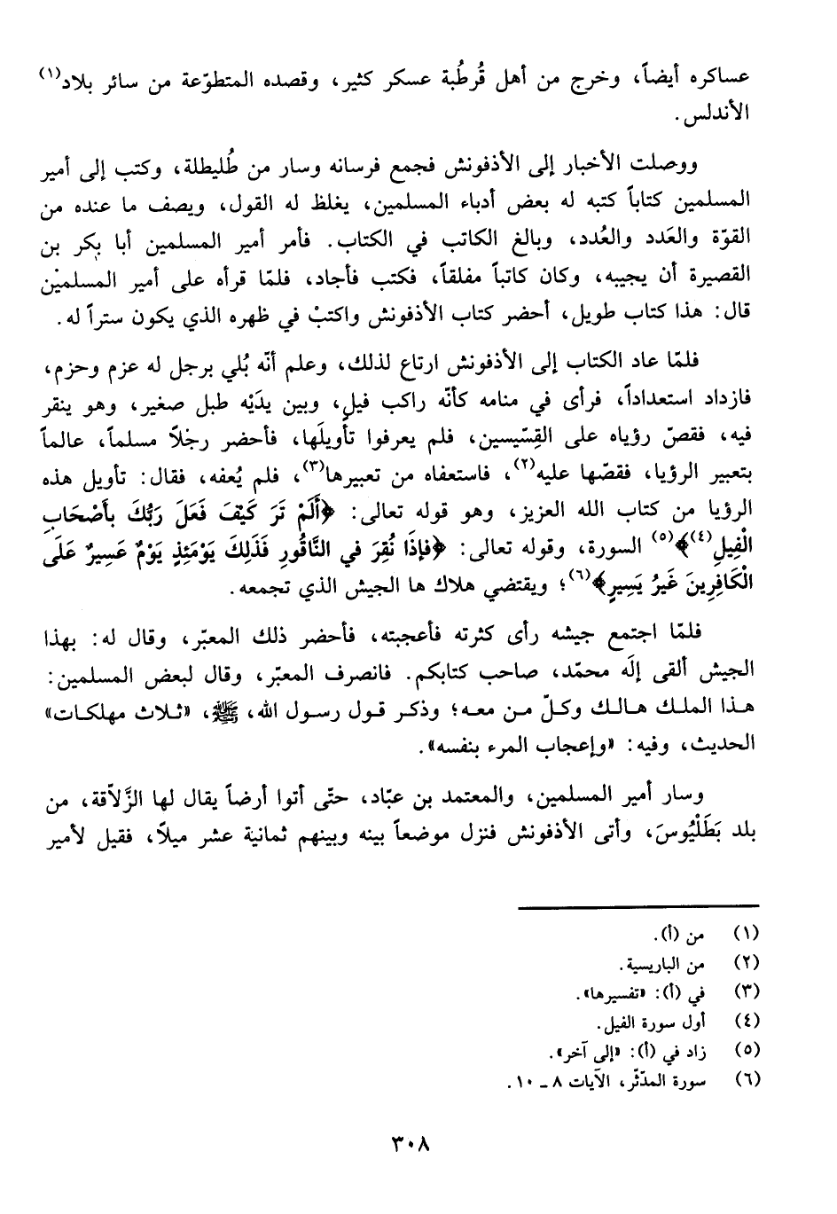 فَلَمَّا عَادَ الْكِتَابُ إِلَى الْأَذْفُونْشِ ارْتَاعَ لِذَلِكَ، وَعَلِمَ أَنَّهُ بُلِيَ بِرَجُلٍ لَهُ عَزْمٌ وَحَزْمٌ، فَازْدَادَ اسْتِعْدَادًا، فَرَأَى فِي مَنَامِهِ كَأَنَّهُ رَاكِبُ فِيلٍ، وَبَيْنَ يَدَيْهِ طَبْلٌ صَغِيرٌ، وَهُوَ يَنْقُرُ فِيهِ، فَقَصَّ رُؤْيَاهُ عَلَى الْقِسِّيسِينَ، فَلَمْ يَعْرِفُوا تَأْوِيلَهَا فَأَحْضَرَ رَجُلًا مُسْلِمًا، عَالِمًا بِتَعْبِيرِ الرُّؤْيَا، فَقَصَّهَا عَلَيْهِ، فَاسْتَعْفَاهُ مِنْ تَعْبِيرِهَا، فَلَمْ يُعْفِهِ، فَقَالَ: تَأْوِيلُ هَذِهِ الرُّؤْيَا مِنْ كِتَابِ اللَّهِ الْعَزِيزِ، وَهُوَ قَوْلُهُ تَعَالَى: {أَلَمْ تَرَ كَيْفَ فَعَلَ رَبُّكَ بِأَصْحَابِ الْفِيلِ} [الفيل: 1] ، وَقَوْلُهُ تَعَالَى: {فَإِذَا نُقِرَ فِي النَّاقُورِ - فَذَلِكَ يَوْمَئِذٍ يَوْمٌ عَسِيرٌ - عَلَى الْكَافِرِينَ غَيْرُ يَسِيرٍ} [المدثر: 8 - 10] ، وَيَقْتَضِي هَلَاكَ هَذَا الْجَيْشِ الَّذِي تَجْمَعُهُ.
