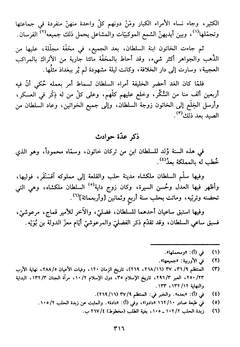 ثُمَّ جَاءَتِ الْخَاتُونُ ابْنَةُ السُّلْطَانِ، بَعْدَ الْجَمِيعِ، فِي مِحَفَّةٍ مُجَلَّلَةٍ، عَلَيْهَا مِنَ الذَّهَبِ وَالْجَوَاهِرِ أَكْثَرُ شَيْءٍ، وَقَدْ أَحَاطَ بِالْمِحَفَّةِ مِائَتَا جَارِيَةٍ مِنَ الْأَتْرَاكِ بِالْمَرَاكِبِ الْعَجِيبَةِ، وَسَارَتْ إِلَى دَارِ الْخِلَافَةِ، وَكَانَتْ لَيْلَةً مَشْهُودَةً لَمْ يُرَ بِبَغْدَاذَ مِثْلَهَا.