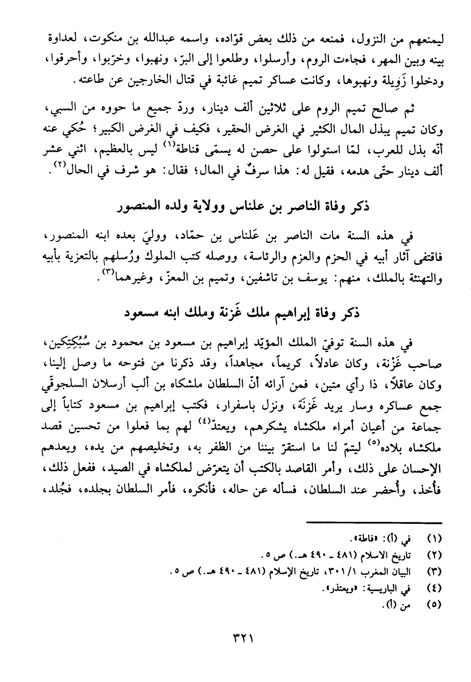فِي هَذِهِ السَّنَةِ تُوُفِّيَ الْمَلِكُ الْمُؤَيِّدُ إِبْرَاهِيمُ بْنُ مَسْعُودِ بْنِ مَحْمُودِ بْنِ سُبُكْتِكِينَ، صَاحِبُ غَزْنَةَ، وَكَانَ عَادِلًا، كَرِيمًا، مُجَاهِدًا، وَقَدْ ذَكَرْنَا مِنْ فُتُوحِهِ مَا وَصَلَ إِلَيْنَا، وَكَانَ عَاقِلًا، ذَا رَأْيٍ مَتِينٍ، فَمِنْ آرَائِهِ أَنَّ السُّلْطَانَ مَلِكْشَاهِ بْنَ أَلْب أَرْسِلَانَ السَّلْجُوقِيَّ جَمَعَ عَسَاكِرَهُ وَسَارَ يُرِيدُ غَزْنَةَ، وَنَزَلَ بِأَسْفَرَارَ، فَكَتَبَ إِبْرَاهِيمُ بْنُ مَسْعُودٍ كِتَابًا إِلَى جَمَاعَةٍ مِنْ أَعْيَانِ أُمَرَاءِ مَلِكْشَاهْ يَشْكُرُهُمْ، وَيَعْتَدُّ لَهُمْ بِمَا فَعَلُوا مِنْ تَحْسِينِ قَصْدِ مَلِكْشَاهْ بِلَادَهُ لِيُتِمَّ لَنَا مَا اسْتَقَرَّ بَيْنَنَا مِنَ الظَّفَرِ بِهِ، وَتَخْلِيصِهِمْ مِنْ يَدِهِ، وَيَعِدُهُمُ الْإِحْسَانَ عَلَى ذَلِكَ، وَأَمَرَ الْقَاصِدَ بِالْكُتُبِ أَنْ يَتَعَرَّضَ لِمَلِكْشَاهْ فِي الصَّيْدِ، فَفَعَلَ ذَلِكَ، فَأُخِذَ، وَأُحْضِرَ عِنْدَ السُّلْطَانِ، فَسَأَلَهُ عَنْ حَالِهِ، فَأَنْكَرَهُ، فَأَمَرَ السُّلْطَانُ بِجَلْدِهِ، فَجُلِدَ،
