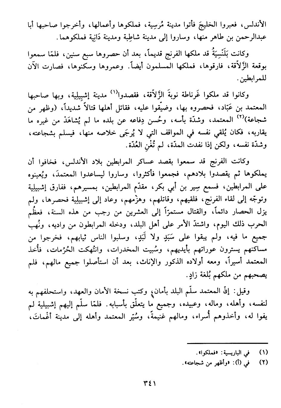 وَكَانَتِ الْفِرِنْجُ قَدْ سَمِعُوا بِقَصْدِ عَسَاكِرِ الْمُرَابِطِينَ بِلَادَ الْأَنْدَلُسِ، فَخَافُوا أَنْ يَمْلِكُوهَا ثُمَّ يَقْصِدُوا بِلَادَهُمْ، فَجَمَعُوا فَأَكْثَرُوا، وَسَارُوا لِيُسَاعِدُوا الْمُعْتَمِدَ، وَيُعِينُوهُ عَلَى الْمُرَابِطِينَ، فَسَمِعَ سِيرُ بْنُ أَبِي بَكْرٍ، مُقَدِّمَ الْمُرَابِطِينَ بِمَسِيرِهِمْ، فَفَارَقَ إِشْبِيلِيَّةَ وَتَوَجَّهَ إِلَى لِقَاءِ الْفِرِنْجِ، فَلَقِيَهُمْ، وَقَاتَلَهُمْ، وَهَزَمَهُمْ، وَعَادَ إِلَى إِشْبِيلِيَّةَ فَحَصَرَهَا، وَلَمْ يَزَلِ الْحِصَارُ دَائِمًا، وَالْقِتَالُ مُسْتَمِرًّا إِلَى الْعِشْرِينَ مِنْ رَجَبٍ مِنْ هَذِهِ السَّنَةِ، فَعَظُمَ الْحَرْبُ ذَلِكَ الْيَوْمَ، وَاشْتَدَّ الْأَمْرُ عَلَى أَهْلِ الْبَلَدِ، وَدَخَلَهُ الْمُرَابِطُونَ مِنْ وَادِيهِ، وَنُهِبَ جَمِيعُ مَا فِيهِ، وَلَمْ يُبْقُوا عَلَى سَبَدٍ وَلَا لَبَدٍ، وَسَلَبُوا النَّاسَ ثِيَابَهُمْ، فَخَرَجُوا مِنْ مَسَاكِنِهِمْ يَسْتُرُونَ عَوْرَاتِهِمْ بِأَيْدِيهِمْ، وَسُبِيَتِ الْمُخَدَّارَتُ، وَانْتُهِكَتِ الْحُرُمَاتُ، فَأُخِذَ الْمُعْتَمِدُ أَسِيرًا، وَمَعَهُ أَوْلَادُهُ الذُّكُورُ وَالْإِنَاثُ، بَعْدَ أَنِ اسْتَأْصَلُوا جَمِيعَ مَالِهِمْ، فَلَمْ يَصْحَبْهُمْ مِنْ مُلْكِهِمْ بُلْغَةُ زَادٍ.