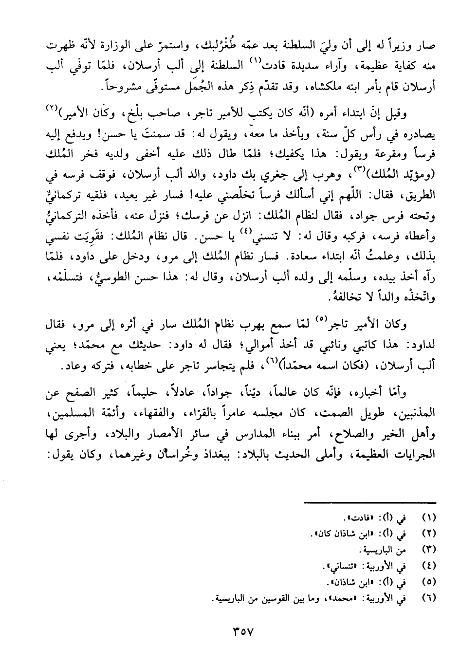 وَكَانَ الْأَمِيرُ تَاجِرُ لَمَّا سَمِعَ بِهَرَبِ نِظَامِ الْمُلْكِ سَارَ فِي أَثَرِهِ إِلَى مَرْوَ، فَقَالَ لِدَاوُدَ: هَذَا كَاتِبِي وَنَائِبِي قَدْ أَخَذَ أَمْوَالِي، فَقَالَ لَهُ دَاوُدُ: حَدِيثُكَ مَعَ مُحَمَّدٍ، يَعْنِي أَلْب أَرْسِلَانَ، (فَكَانَ اسْمُهُ مُحَمَّدًا) ، فَلَمْ يَتَجَاسَرْ تَاجِرٌ عَلَى خِطَابِهِ، فَتَرَكَهُ وَعَادَ.