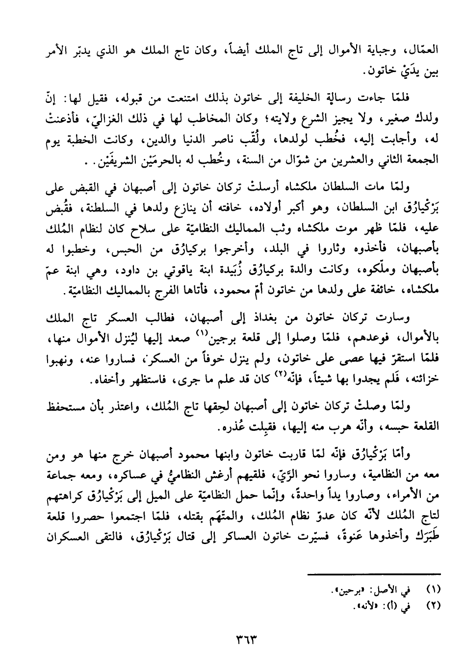 وَأَمَّا بَرْكِيَارُقُ فَإِنَّهُ لَمَّا قَارَبَتْ خَاتُونُ، وَابْنُهَا مَحْمُودٌ أَصْبَهَانَ خَرَجَ مِنْهَا هُوَ، وَمَنْ مَعَهُ مِنَ النِّظَامِيَّةِ، وَسَارُوا نَحْوَ الرَّيِّ، فَلَقِيَهُمْ أَرَغْشُ النِّظَامِيُّ فِي عَسَاكِرِهِ، وَمَعَهُ جَمَاعَةٌ مِنَ الْأُمَرَاءِ، وَصَارُوا يَدًا وَاحِدَةً، وَإِنَّمَا حَمَلَ النِّظَامِيَّةَ عَلَى الْمَيْلِ إِلَى بَرْكِيَارُقَ كَرَاهَتُهُمْ لِتَاجِ الْمُلْكِ لِأَنَّهُ كَانَ عَدُوَّ نِظَامِ الْمُلْكِ، وَالْمُتَّهَمَ بِقَتْلِهِ، فَلَمَّا اجْتَمَعُوا حَصَرُوا قَلْعَةَ طَبْرَكَ وَأَخَذُوهَا عَنْوَةً، فَسَيَّرَتْ خَاتُونُ الْعَسَاكِرَ إِلَى قِتَالِ بَرْكِيَارُقَ،