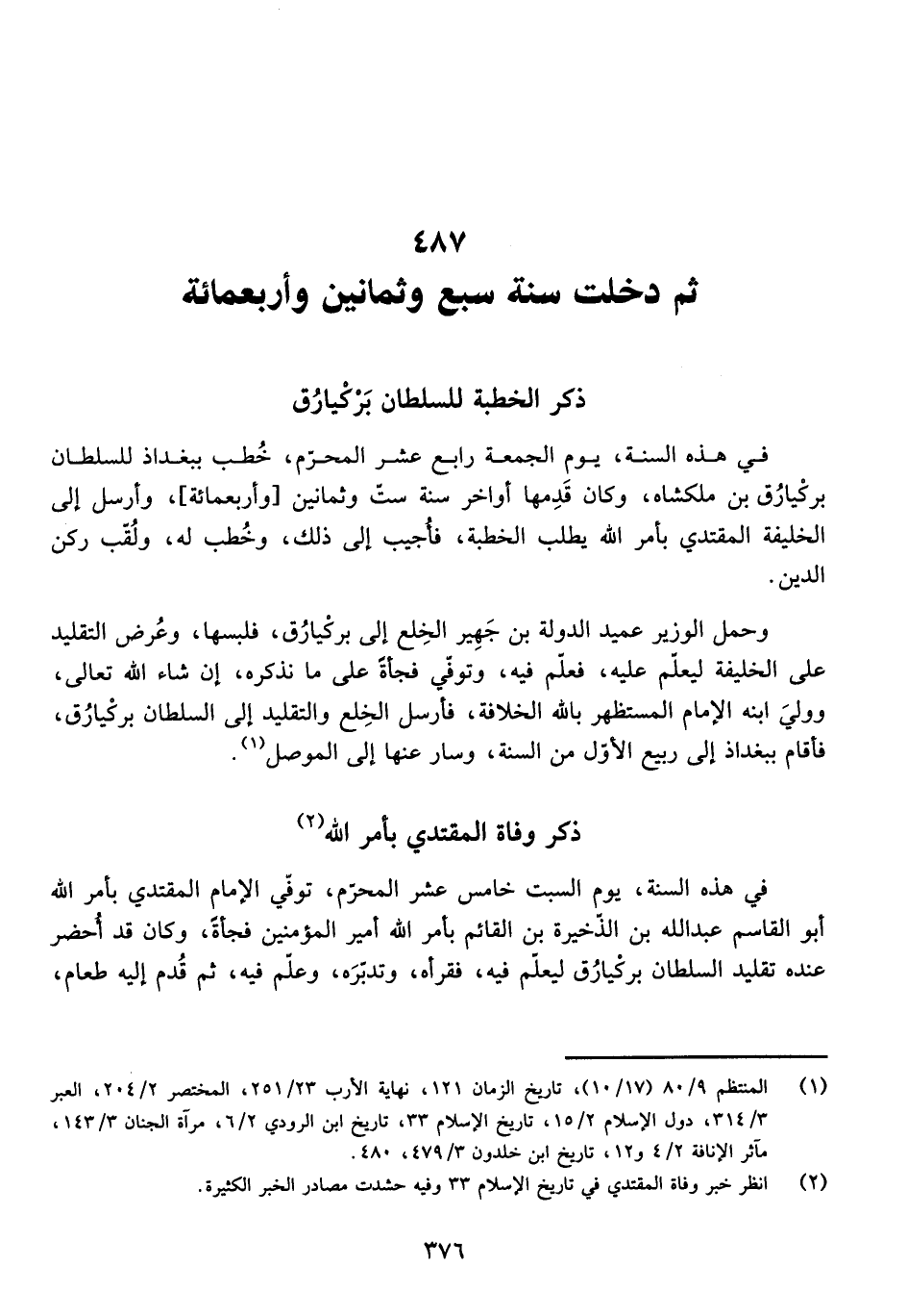 فِي هَذِهِ السَّنَةِ، يَوْمَ الْجُمْعَةِ رَابِعَ عَشَرَ الْمُحَرَّمِ، خُطِبَ بِبَغْدَاذَ لِلسُّلْطَانِ بَرْكِيَارُقَ بْنِ مَلِكْشَاهْ، وَكَانَ قَدِمَهَا أَوَاخِرَ سَنَةِ سِتٍّ وَثَمَانِينَ وَأَرْبَعِمِائَةٍ، وَأَرْسَلَ إِلَى الْخَلِيفَةِ الْمُقْتَدِي بِأَمْرِ اللَّهِ يَطْلُبُ الْخُطْبَةَ، فَأُجِيبَ إِلَى ذَلِكَ، وَخُطِبَ لَهُ، وَلُقِّبَ رُكْنَ الدِّينِ.