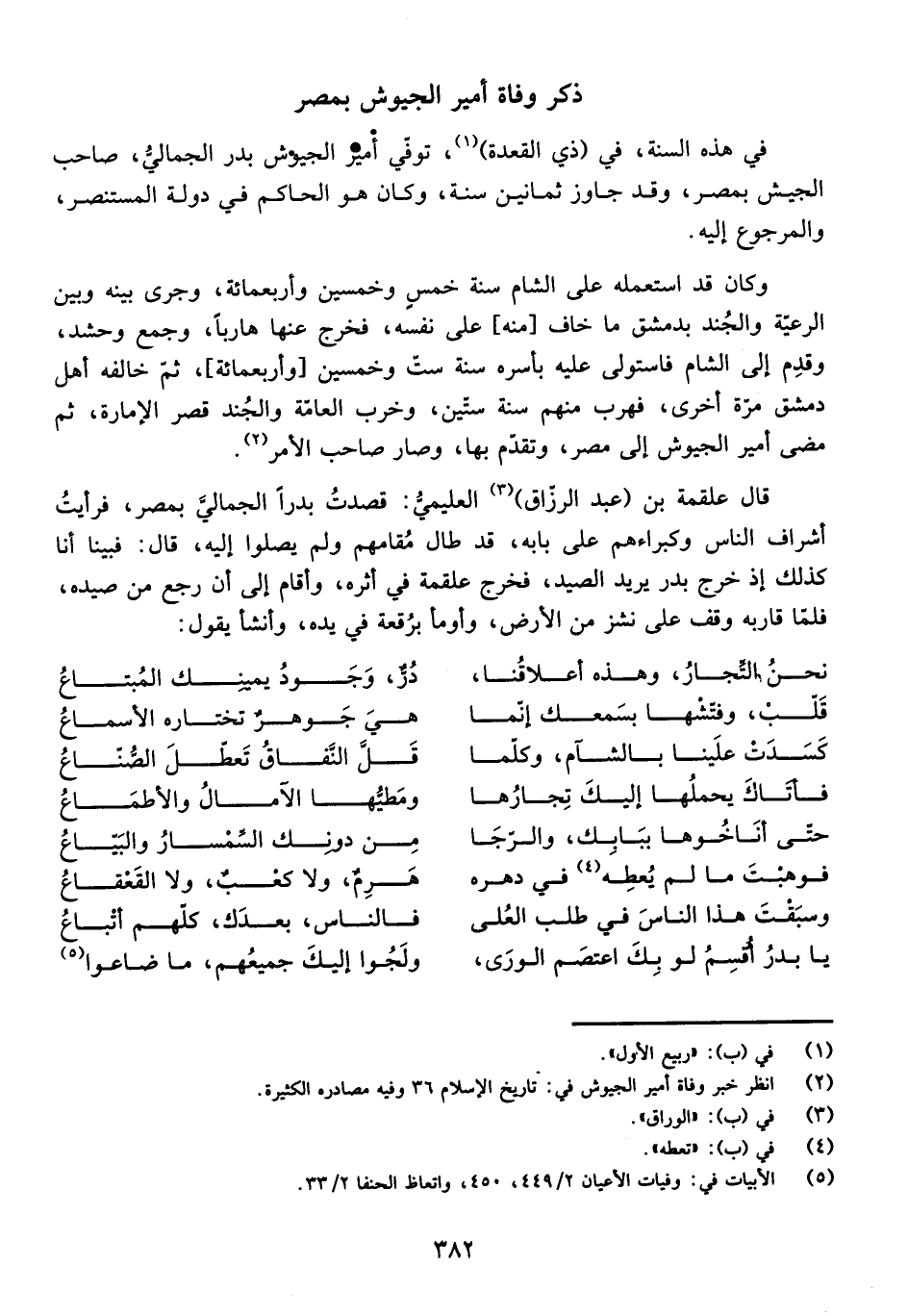 فِي هَذِهِ السَّنَةِ، (فِي ذِي الْقَعْدَةِ) ، تُوُفِّيَ أَمِيرُ الْجُيُوشِ بَدْرٌ الْجَمَالِيُّ، صَاحِبُ الْجَيْشِ بِمِصْرَ، وَقَدْ جَاوَزَ ثَمَانِينَ سَنَةً، وَكَانَ هُوَ الْحَاكِمَ فِي دَوْلَةِ الْمُسْتَنْصِرِ، وَالْمَرْجُوعَ إِلَيْهِ.