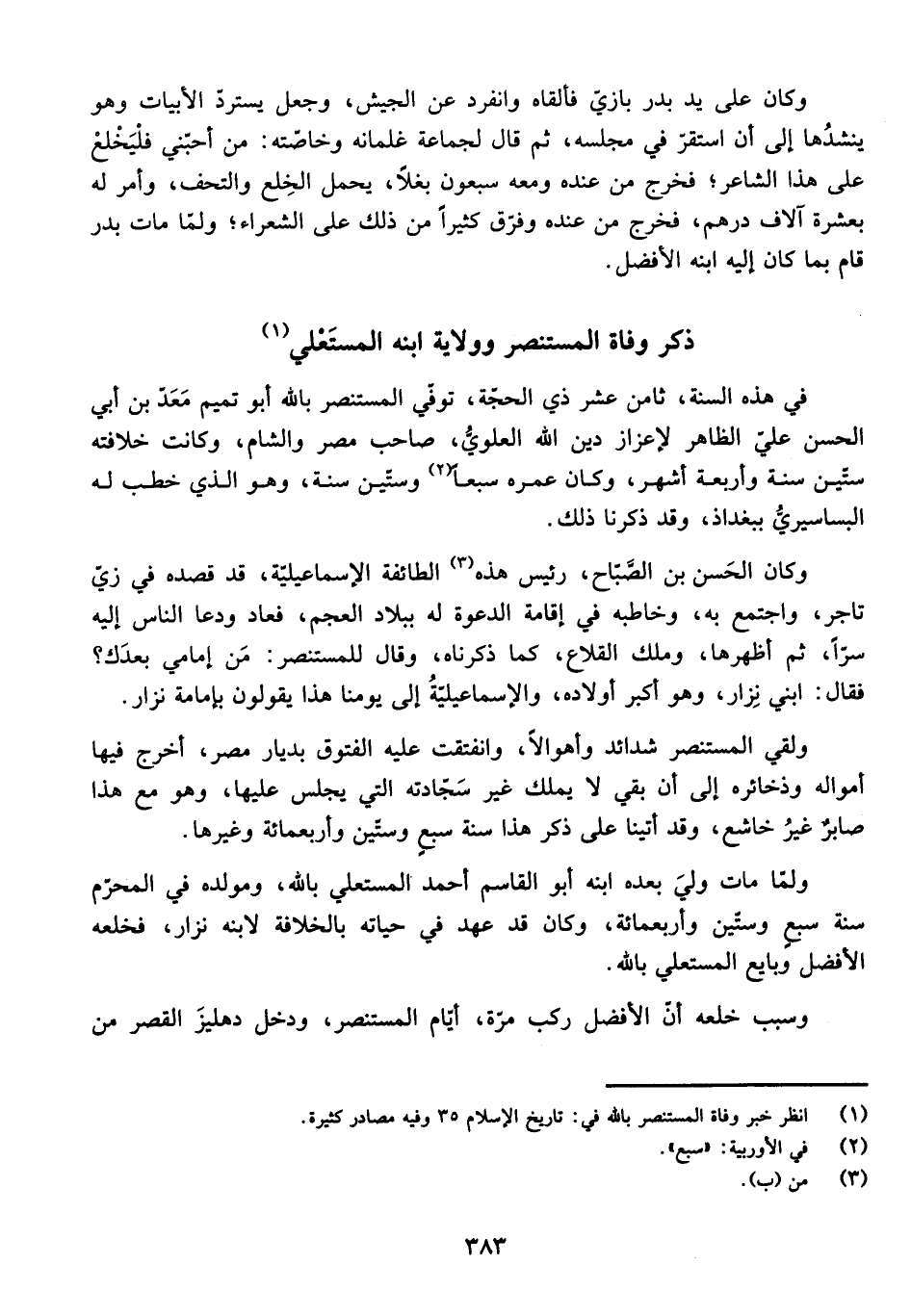 وَكَانَ الْحَسَنُ بْنُ الصَّبَاحِ، رَئِيسَ هَذِهِ الطَّائِفَةِ الْإِسْمَاعِيلِيَّةِ، قَدْ قَصَدَهُ فِي زِيِّ تَاجِرٍ، وَاجْتَمَعَ بِهِ، وَخَاطَبَهُ فِي إِقَامَةِ الدَّعْوَةِ لَهُ بِبِلَادِ الْعَجَمِ، فَعَادَ وَدَعَا النَّاسَ إِلَيْهِ سِرًّا، ثُمَّ أَظْهَرَهَا، وَمَلَكَ الْقِلَاعَ، كَمَا ذَكَرْنَاهُ، وَقَالَ لِلْمُسْتَنْصِرِ: مَنْ إِمَامِي بَعْدَكَ؟ فَقَالَ: ابْنِي نِزَارٌ، وَهُوَ أَكْبَرُ أَوْلَادِهِ، وَالْإِسْمَاعِيلِيَّةُ إِلَى يَوْمِنَا هَذَا يَقُولُونَ بِإِمَامَةِ نِزَارٍ.