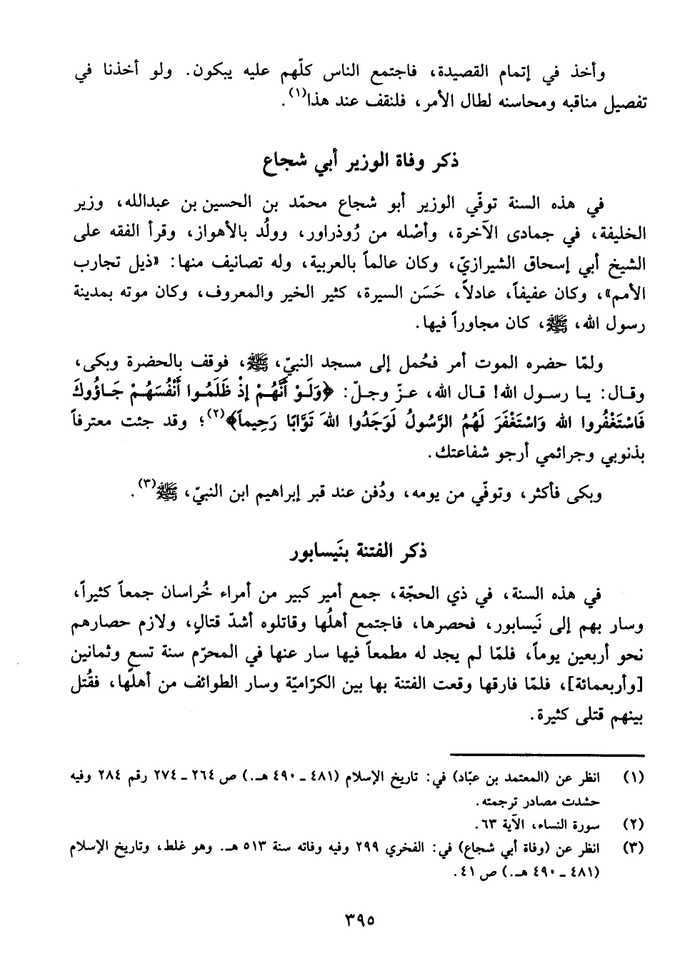 فِي هَذِهِ السَّنَةِ تُوُفِّيَ الْوَزِيرُ أَبُو شُجَاعٍ مُحَمَّدُ بْنُ الْحَسَنِ بْنِ عَبْدِ اللَّهِ، وَزِيرُ الْخَلِيفَةِ، فِي جُمَادَى الْآخِرَةِ، وَأَصْلُهُ مِنْ رُوذَرَاوَرَ، وَوَلُدِ بِالْأَهْوَازِ، وَقَرَأَ الْفِقْهَ عَلَى الشَّيْخِ أَبِي إِسْحَاقَ الشِّيرَازِيِّ، وَكَانَ عَالِمًا بِالْعَرَبِيَّةِ، وَلَهُ تَصَانِيفُ مِنْهَا: ذَيَلُ تَجَارِبِ الْأُمَمِ، وَكَانَ عَفِيفًا، عَادِلًا، حَسَنَ السِّيرَةِ، كَثِيرَ الْخَيْرِ وَالْمَعْرُوفِ، وَكَانَ مَوْتُهُ بِمَدِينَةِ رَسُولِ اللَّهِ، - صَلَّى اللَّهُ عَلَيْهِ وَسَلَّمَ -، كَانَ مُجَاوِرًا فِيهَا.