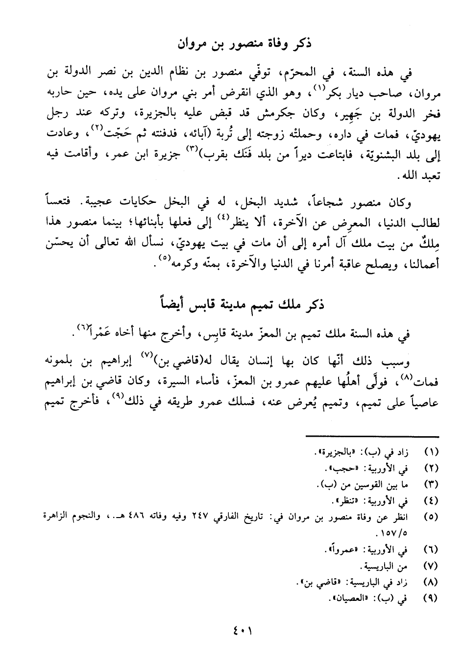 فِي هَذِهِ السَّنَةِ، فِي الْمُحَرَّمِ، تُوَفِّي مَنْصُورُ بْنُ نِظَامِ الدِّينِ بْنِ نَصْرِ الدَّوْلَةِ بْنِ مَرْوَانَ، صَاحِبُ دِيَارِ بَكْرٍ، وَهُوَ الَّذِي انْقَرَضَ أَمْرُ بَنِي مَرْوَانَ عَلَى يَدِهِ، حِينَ حَارَبَهُ فَخْرُ الدَّوْلَةِ بْنُ جَهِيرٍ، وَكَانَ جَكَرْمَشُ قَدْ قُبِضَ عَلَيْهِ بِالْجَزِيرَةِ، وَتَرَكَهُ عِنْدَ رَجُلٍ يَهُودِيٍّ، فَمَاتَ فِي دَارِهِ، وَحَمْلَتْهُ زَوْجَتُهُ إِلَى تُرْبَةِ (آبَائِهِ، فَدَفَنَتْهُ ثُمَّ حَجَّتْ، وَعَادَتْ إِلَى بَلَدِ الْبَشْنَوِيَّةِ، فَابْتَاعَتْ دِيرًا مِنْ بَلَدِ فَنَكَ بِقُرْبِ) جَزِيرَةِ ابْنِ عُمَرَ، وَأَقَامَتْ فِيهِ تَعْبُدُ اللَّهَ.