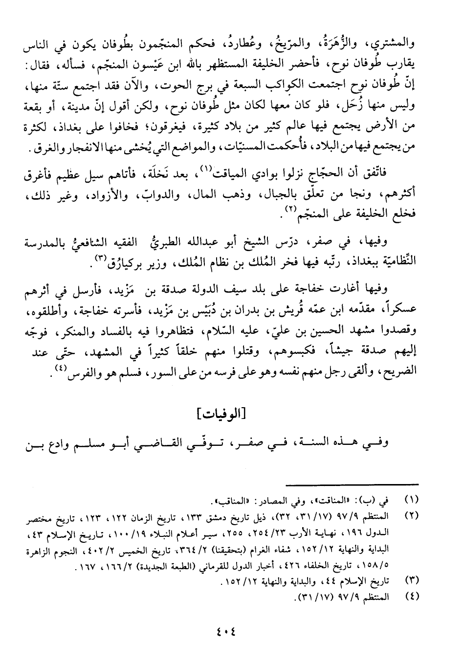 وَالْمُشْتَرَى، وَالزَّهْرَةُ، وَالْمَرِّيخُ، وَعُطَارِدُ، فَحَكَمَ الْمُنَجِّمُونَ بِطُوفَانٍ يَكُونُ فِي النَّاسِ يُقَارِبُ طُوفَانَ نُوحٍ، فَأَحْضَرَ الْخَلِيفَةُ الْمُسْتَظْهِرُ بِاللَّهِ ابْنَ عَيْسُونَ الْمُنَجِّمَ، فَسَأَلَهُ، فَقَالَ: إِنَّ طُوفَانَ نُوحٍ اجْتَمَعَتِ الْكَوَاكِبُ السَّبْعَةُ فِي بُرْجِ الْحُوتِ، وَالْآنَ فَقَدِ اجْتَمَعَ سِتَّةٌ مِنْهَا، وَلَيْسَ مِنْهَا زُحَلُ، فَلَوْ كَانَ مَعَهَا لَكَانَ مِثْلَ طُوفَانِ نُوحٍ، وَلَكِنْ أَقُولُ إِنَّ مَدِينَةً، أَوْ بُقْعَةً مِنَ الْأَرْضِ يَجْتَمِعُ فِيهَا عَالَمٌ كَثِيرٌ مِنْ بِلَادٍ كَثِيرَةٍ، فَيَغْرَقُونَ، فَخَافُوا عَلَى بَغْدَاذَ، لِكَثْرَةِ مَنْ يَجْتَمِعُ فِيهَا مِنَ الْبِلَادِ، فَأُحْكِمَتِ الْمُسَنِّيَاتُ، وَالْمَوَاضِعُ الَّتِي يُخْشَى مِنْهَا الِانْفِجَارُ وَالْغَرَقُ.