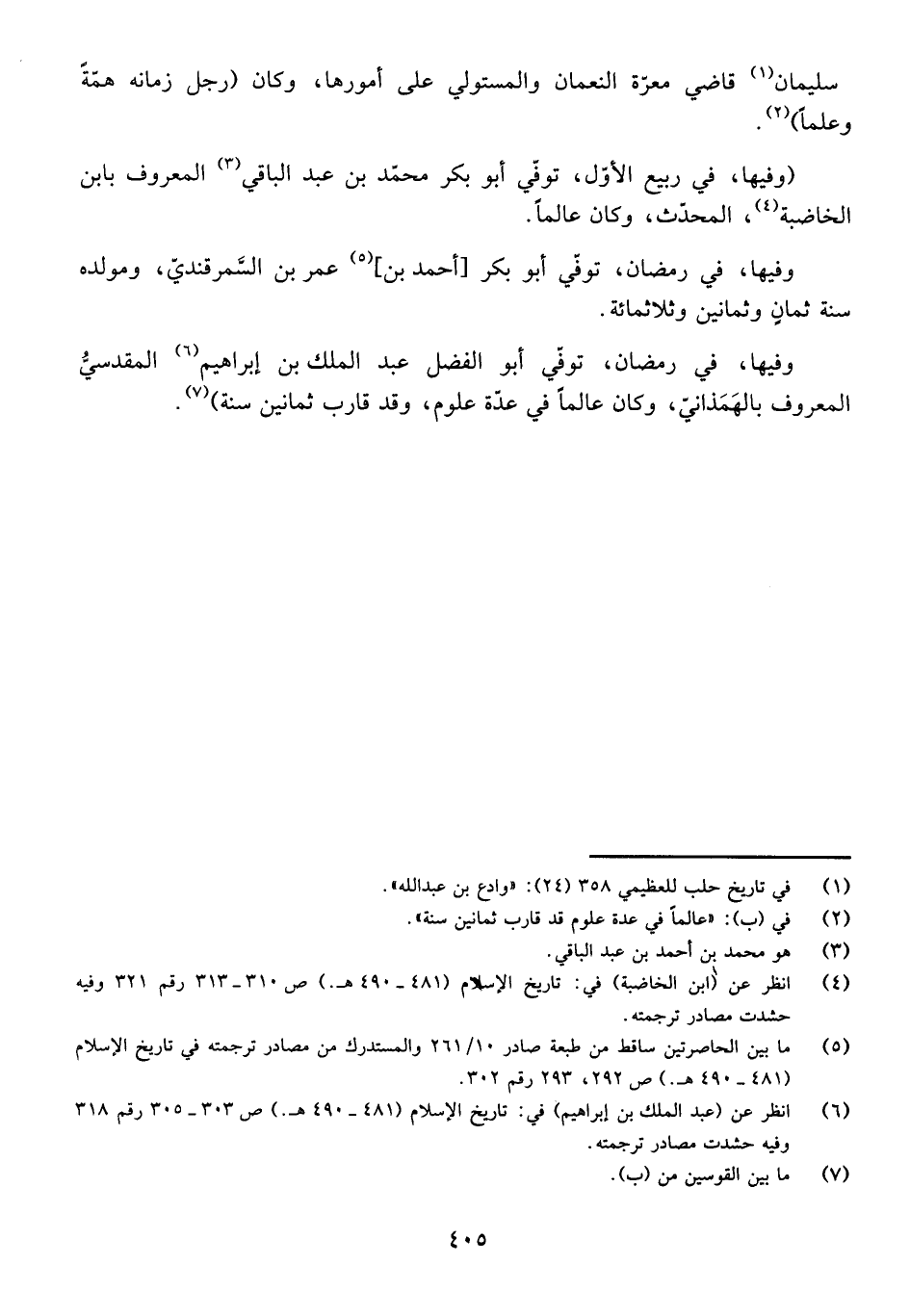 سُلَيْمَانَ قَاضِي مَعَرَّةِ النُّعْمَانِ وَالْمُسْتَوْلِي عَلَى أُمُورِهَا، وَكَانَ (رَجُلَ زَمَانِهِ هِمَّةً) ، وَعِلْمًا.