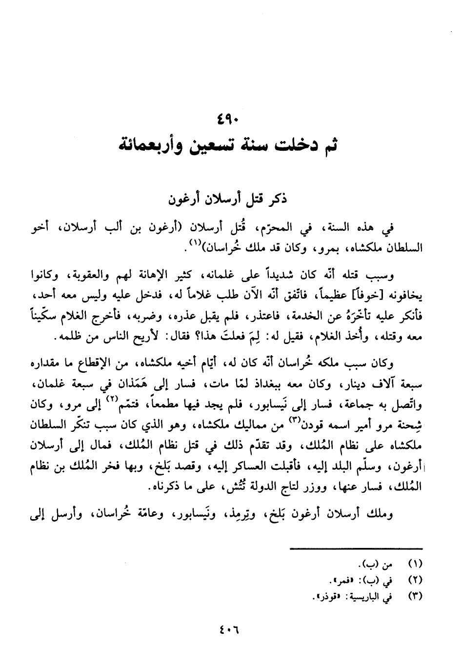 فِي هَذِهِ السَّنَةِ، فِي الْمُحَرَّمِ، قُتِلَ أَرْسَلَانُ (أَرْغُوَنُ بْنُ أَلْبٍ، أَخُو السُّلْطَانِ مَلِكْشَاهْ، بِمَرْوَ، وَكَانَ قَدْ مَلَكَ خُرَاسَانَ) .