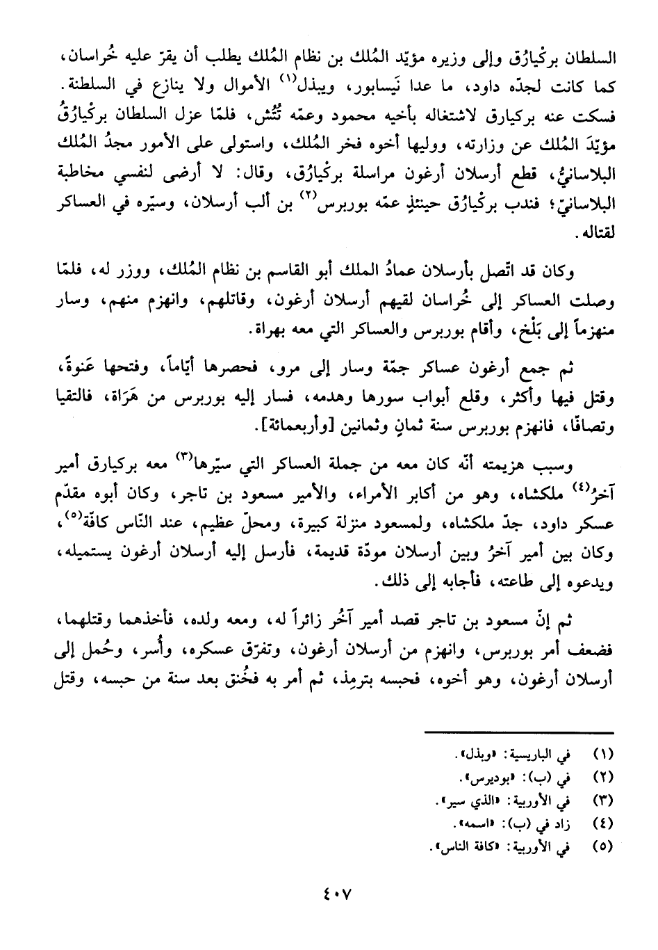 وَكَانَ قَدِ اتَّصَلَ بِأَرْسِلَانَ عِمَادُ الْمُلْكِ أَبُو الْقَاسِمِ بْنُ نِظَامِ الْمُلْكِ، وَوَزَرَ لَهُ، فَلَمَّا وَصَلَتِ الْعَسَاكِرُ إِلَى خُرَاسَانَ لَقِيَهُمْ أَرْسَلَانُ أَرْغُوَنَ، وَقَاتَلَهُمْ، وَانْهَزَمَ مِنْهُمْ، وَسَارَ مُنْهَزِمًا إِلَى بَلْخَ، وَأَقَامَ بُورْبُرُسُ وَالْعَسَاكِرُ الَّتِي مَعَهُ بِهَرَاةَ.