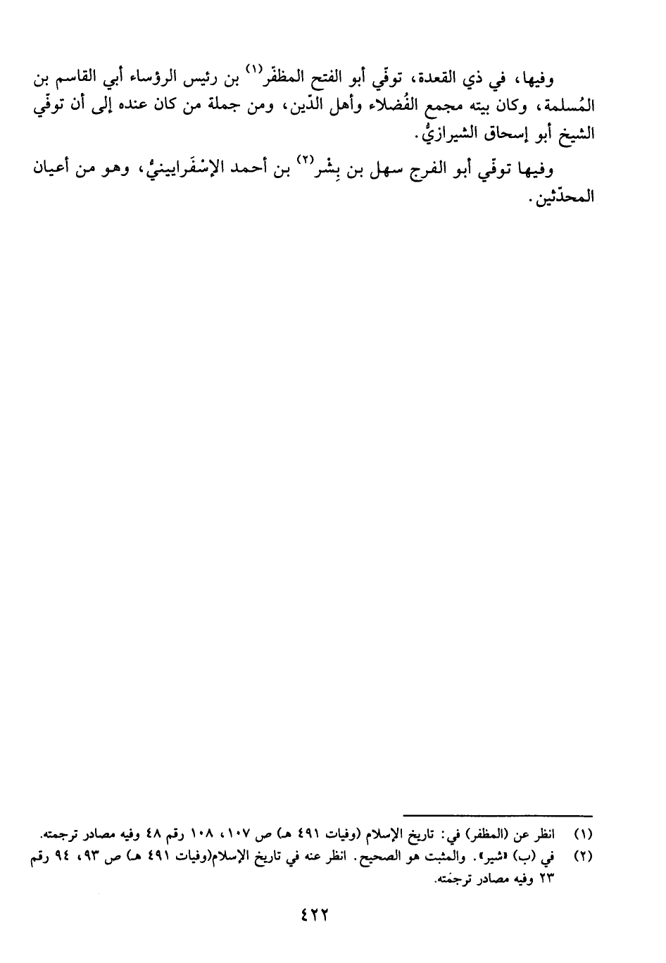 وَفِيهَا، فِي ذِي الْقَعْدَةِ، تُوُفِّيَ أَبُو الْفَتْحِ الْمُظَفَّرُ بْنُ رَئِيسِ الرُّؤَسَاءِ أَبِي الْقَاسِمِ بْنِ الْمُسْلِمَةِ، وَكَانَ بَيْتُهُ مَجْمَعَ الْفُضَلَاءِ وَأَهْلِ الدِّينِ، وَمِنْ جُمْلَةِ مَنْ كَانَ عِنْدَهُ إِلَى أَنْ تُوُفِّيَ الشَّيْخُ أَبُو إِسْحَاقَ الشِّيرَازِيُّ. وَفِيهَا تُوُفِّيَ أَبُو الْفَرَجِ سَهْلُ بْنُ بِشْرِ بْنِ أَحْمَدَ الْإِسْفَرَايِينِيُّ، وَهُوَ مِنْ أَعْيَانِ الْمُحَدِّثِينَ.