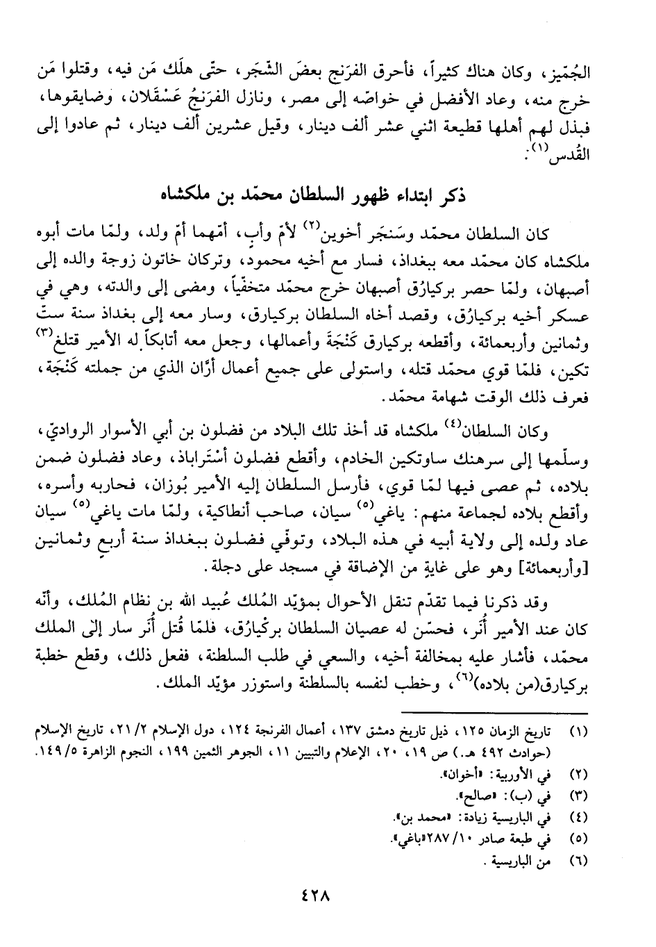 وَقَدْ ذَكَرْنَا فِيمَا تَقَدَّمَ تَنَقُّلَ الْأَحْوَالِ بِمُؤَيَّدِ الْمُلْكِ عُبَيْدِ اللَّهِ بْنِ نِظَامِ الْمُلْكِ، وَأَنَّهُ كَانَ عِنْدَ الْأَمِيرِ أُنَرَ، فَحَسَّنَ لَهُ عِصْيَانَ السُّلْطَانِ بَرْكِيَارُقَ، فَلَمَّا قُتِلَ أُنَرُ سَارَ إِلَى الْمَلِكِ مُحَمَّدٍ، فَأَشَارَ عَلَيْهِ بِمُخَالَفَةِ أَخِيهِ، وَالسَّعْيِ فِي طَلَبِ السَّلْطَنَةِ، فَفَعَلَ ذَلِكَ، وَقَطَعَ خُطْبَةَ بَرْكِيَارُقَ مِنْ بِلَادِهِ، وَخَطَبَ لِنَفْسِهِ بِالسَّلْطَنَةِ وَاسْتَوْزَرَ مُؤَيَّدَ الْمُلْكِ.