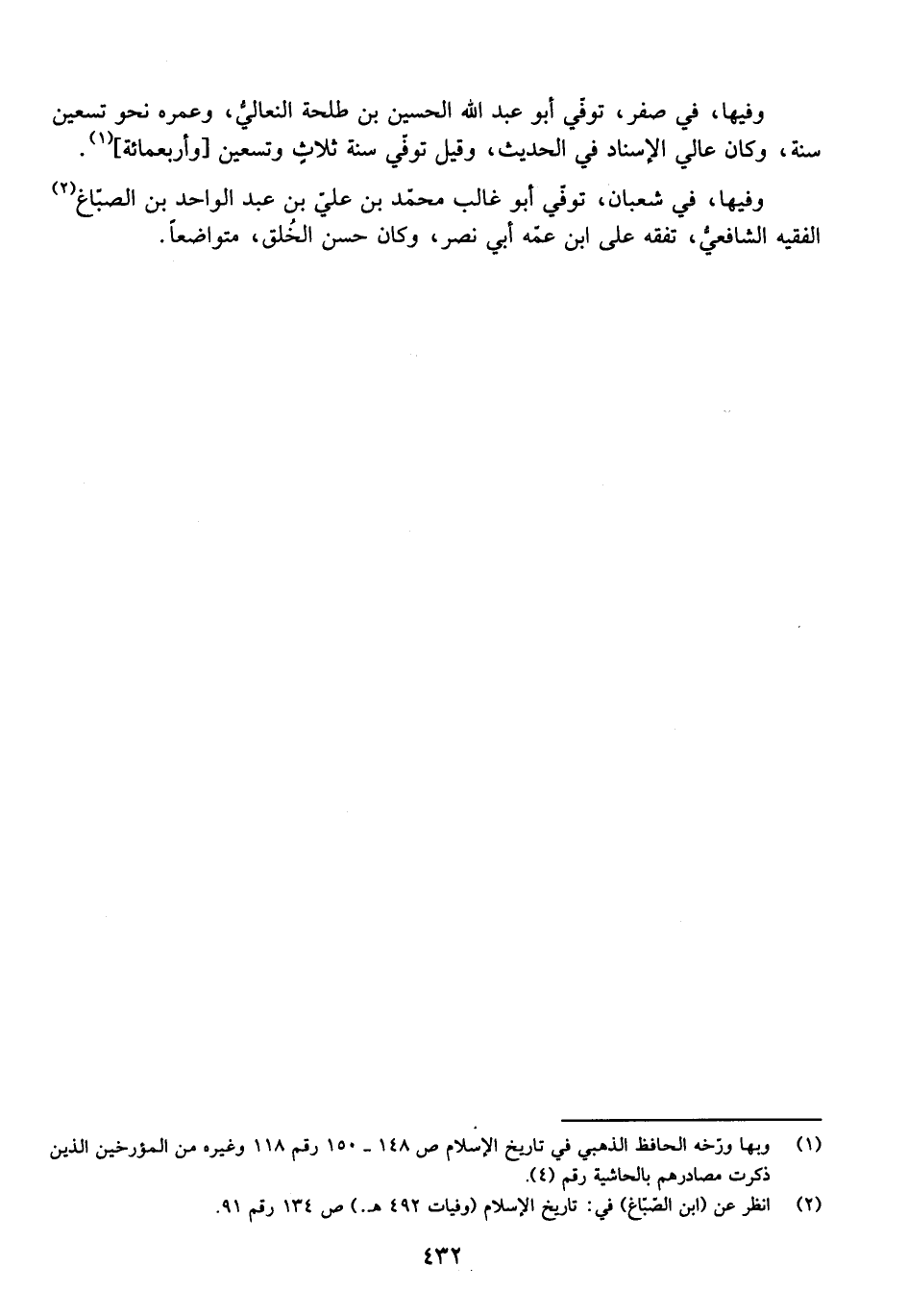 وَفِيهَا، فِي صَفَرٍ، تُوُفِّيَ أَبُو عُبَيْدِ اللَّهِ الْحُسَيْنُ بْنُ طَلْحَةَ النِّعَالِيُّ، وَعُمْرُهُ نَحْوُ تِسْعِينَ سَنَةً وَكَانَ عَالِيَ الْإِسْنَادِ فِي الْحَدِيثِ، وَقِيلَ تُوُفِّيَ سَنَةَ ثَلَاثٍ وَتِسْعِينَ وَأَرْبَعِمِائَةٍ.