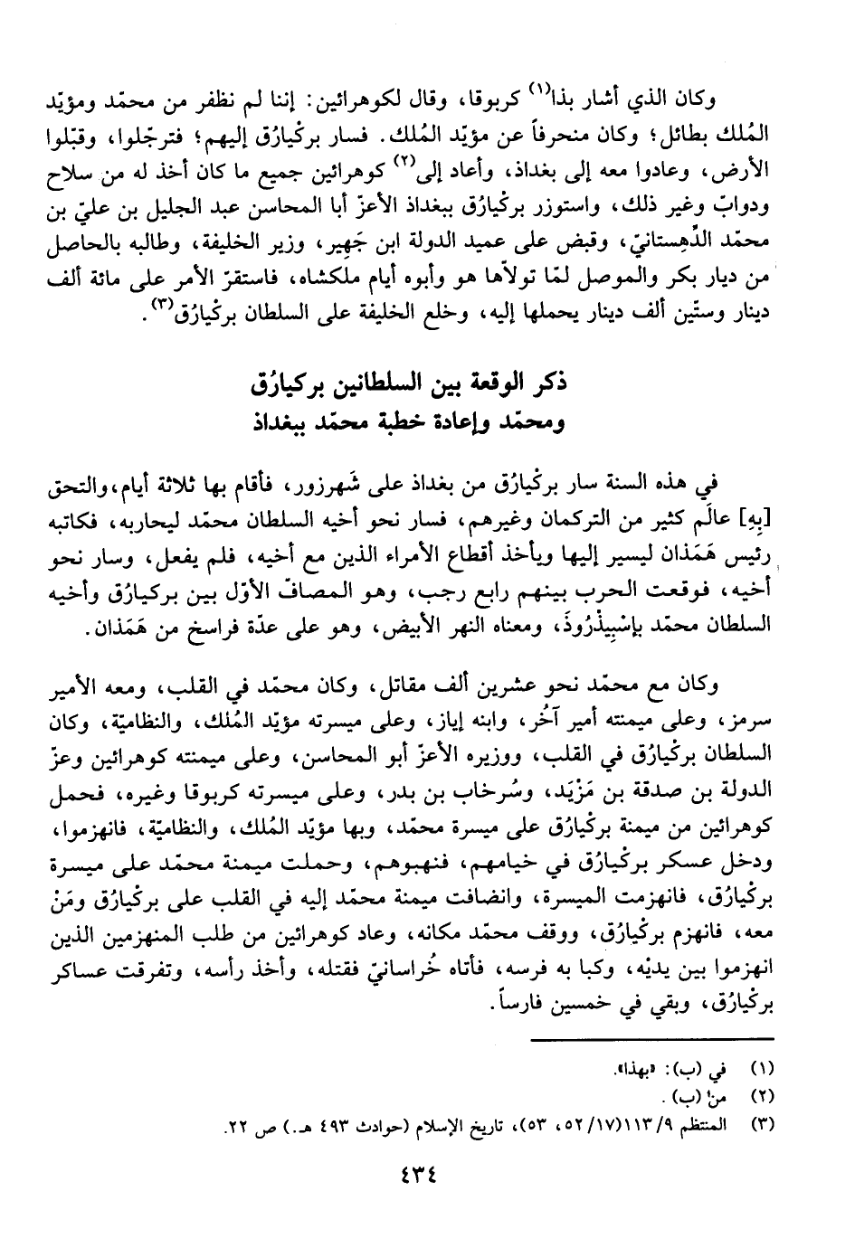 وَكَانَ مَعَ مُحَمَّدٍ نَحْوُ عِشْرِينَ أَلْفَ مُقَاتِلٍ، وَكَانَ مُحَمَّدٌ فِي الْقَلْبِ، وَمَعَهُ الْأَمِيرُ سُرْمُزُ، وَعَلَى مَيْمَنَتِهِ أَمِيرٌ آخَرُ، وَابْنُهُ إِيَازُ، وَعَلَى مَيْسَرَتِهِ مُؤَيَّدُ الْمُلْكِ، وَالنِّظَامِيَّةُ، وَكَانَ السُّلْطَانُ بَرْكِيَارُقُ فِي الْقَلْبِ، وَوَزِيرُهُ الْأَعَزُّ أَبُو الْمَحَاسِنِ، وَعَلَى مَيْمَنَتِهِ كُوهْرَائِينُ وَعِزُّ الدَّوْلَةِ بْنُ صَدَقَةَ بْنِ مَزِيدٍ، وَسُرْخَابُ بْنُ بَدْرٍ، وَعَلَى مَيْسَرَتِهِ كَرْبُوقَا وَغَيْرُهُ، فَحَمَلَ كُوهْرَائِينُ مِنْ مَيْمَنَةِ بَرْكِيَارُقَ عَلَى مَيْسَرَةِ مُحَمَّدٍ، وَبِهَا مُؤَيَّدُ الْمُلْكِ، وَالنِّظَامِيَّةُ، فَانْهَزَمُوا، وَدَخَلَ عَسْكَرُ بَرْكِيَارُقَ فِي خِيَامِهِمْ، فَنَهَبُوهُمْ، وَحَمَلَتْ مَيْمَنَةُ مُحَمَّدٍ عَلَى مَيْسَرَةِ بَرْكِيَارُقَ، فَانْهَزَمَتِ الْمُيَسَّرَةُ، وَانْضَافَتْ مَيْمَنَةُ مُحَمَّدٍ إِلَيْهِ فِي الْقَلْبِ عَلَى بَرْكِيَارُقَ وَمَنْ مَعَهُ، فَانْهَزَمَ بَرْكِيَارُقُ، وَوَقَفَ مُحَمَّدٌ مَكَانَهُ، وَعَادَ كُوهْرَائِينُ مِنْ طَلَبِ الْمُنْهَزِمِينَ الَّذِينَ انْهَزَمُوا بَيْنَ يَدَيْهِ، وَكَبَا بِهِ فَرَسُهُ، فَأَتَاهُ خُرَاسَانِيٌّ فَقَتَلَهُ، وَأَخَذَ رَأْسَهُ، وَتَفَرَّقَتْ عَسَاكِرُ بَرْكِيَارُقَ، وَبَقِيَ فِي خَمْسِينَ فَارِسًا.