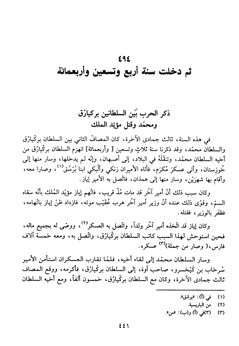 فِي هَذِهِ السَّنَةِ، ثَالِثَ جُمَادَى الْآخِرَةِ، كَانَ الْمَصَافُّ الثَّانِي بَيْنَ السُّلْطَانِ بَرْكِيَارُقَ وَالسُّلْطَانِ مُحَمَّدٍ، وَقَدْ ذَكَرْنَا سَنَةَ ثَلَاثٍ وَتِسْعِينَ [وَأَرْبَعِمِائَةٍ] انْهِزَامَ السُّلْطَانِ بَرْكِيَارُقَ مِنْ أَخِيهِ السُّلْطَانِ مُحَمَّدٍ، وَتَنَقُّلَهُ فِي الْبِلَادِ، إِلَى أَصْبَهَانَ. وَأَنَّهُ لَمْ يَدْخُلْهَا، وَسَارَ مِنْهَا إِلَى خُوزِسْتَانَ، وَأَتَى عَسْكَرَ مُكْرَمٍ، فَأَتَاهُ الْأَمِيرَانِ زَنْكِي وَأَلْبَكْي ابْنَا بُرْسُقَ، وَصَارَا مَعَهُ، وَأَقَامَ بِهَا شَهْرَيْنِ، وَسَارَ مِنْهَا إِلَى هَمَذَانَ، فَاتَّصَلَ بِهِ الْأَمِيرُ إِيَازُ.