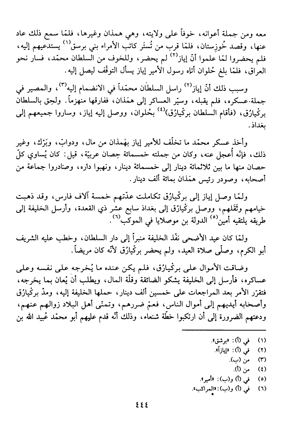 وَلَمَّا وَصَلَ إِيَازُ إِلَى بَرْكِيَارُقَ تَكَامَلَتْ عِدَّتُهُمْ خَمْسَةَ آلَافِ فَارِسٍ، وَقَدْ ذَهَبَتْ خِيَامُهُمْ وَثَقَلُهُمْ وَوَصَلَ بَرْكِيَارُقُ إِلَى بَغْدَاذَ سَابِعَ عَشَرَ ذِي الْقَعْدَةِ، وَأَرْسَلَ الْخَلِيفَةُ إِلَى طَرِيقِهِ يِلْتَقِيهِ أَمِينَ الدَّوْلَةِ بْنَ مُوصْلَايَا فِي الْمَوْكِبِ، وَلَمَّا كَانَ عِيدُ الْأَضْحَى نَفَّذَ الْخَلِيفَةُ مِنْبَرًا إِلَى دَارِ السُّلْطَانِ، وَخَطَبَ عَلَيْهِ الشَّرِيفُ أَبُو الْكَرَمِ، وَصَلَّى صَلَاةَ الْعِيدِ، وَلَمْ يَحْضُرْ بَرْكِيَارُقُ لِأَنَّهُ كَانَ مَرِيضًا.