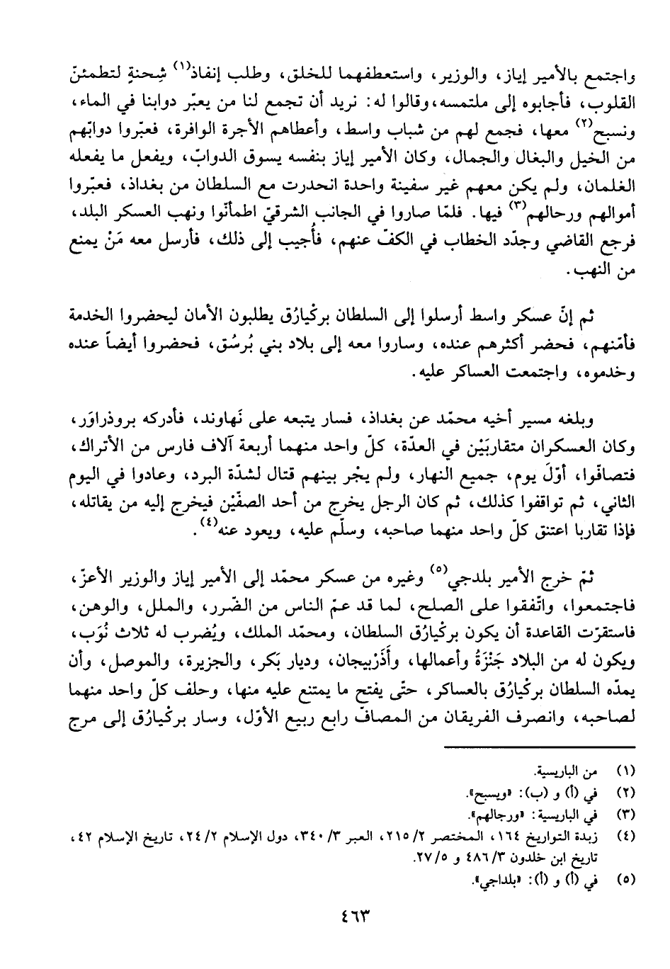 ثُمَّ إِنَّ عَسْكَرَ وَاسِطَ أَرْسَلُوا إِلَى السُّلْطَانِ بَرْكِيَارُقَ يَطْلُبُونَ الْأَمَانَ لِيَحْضُرُوا الْخِدْمَةَ فَأَمَّنَهُمْ، فَحَضَرَ أَكْثَرُهُمْ عِنْدَهُ، وَسَارُوا مَعَهُ إِلَى بِلَادِ بَنِي بُرْسُقَ، فَحَضَرُوا أَيْضًا عِنْدَهُ وَخَدَمُوهُ، وَاجْتَمَعَتِ الْعَسَاكِرُ عَلَيْهِ.