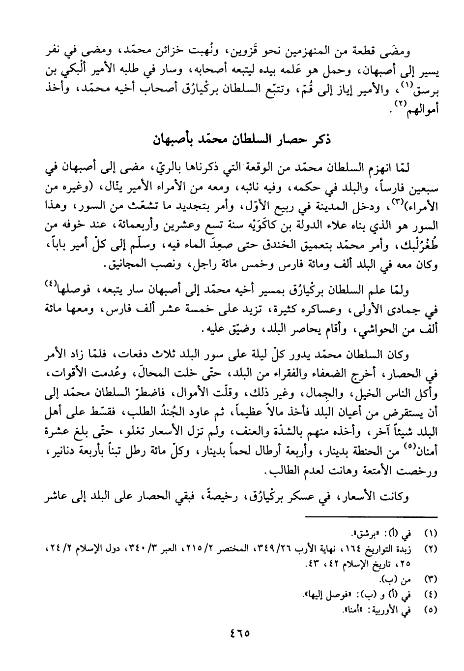 وَلَمَّا عَلِمَ السُّلْطَانُ بَرْكِيَارُقُ بِمَسِيرِ أَخِيهِ مُحَمَّدٍ إِلَى أَصْبَهَانَ سَارَ يَتْبَعُهُ، فَوَصَلَهَا فِي جُمَادَى الْأُولَى، وَعَسَاكِرُهُ كَثِيرَةٌ، تَزِيدُ عَلَى خَمْسَةَ عَشَرَ أَلْفَ فَارِسٍ، وَمَعَهَا مِائَةُ أَلْفٍ مِنَ الْحَوَاشِي، وَأَقَامَ يُحَاصِرُ الْبَلَدَ، وَضَيَّقَ عَلَيْهِ.