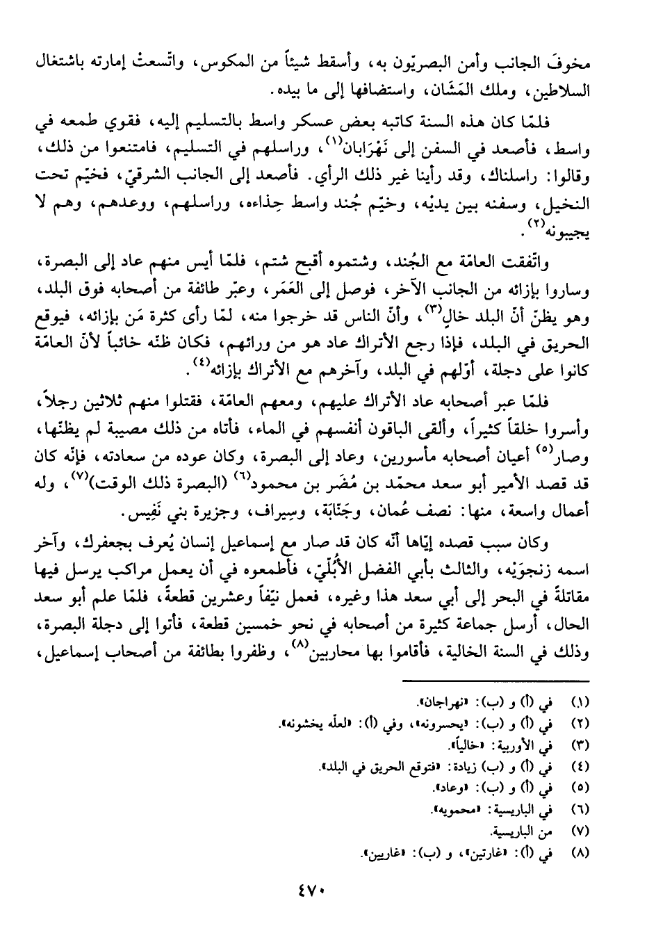 وَكَانَ سَبَبُ قَصْدِهِ إِيَّاهَا أَنَّهُ كَانَ قَدْ صَارَ مَعَ إِسْمَاعِيلَ إِنْسَانٌ يُعْرَفُ بِجَعْفَرْكَ، وَآخِرٌ اسْمُهُ زَنْجَوَيْهِ، وَالثَّالِثُ بِأَبِي الْفَضْلِ الْأُبُلِّيِّ، فَأَطْمَعُوهُ فِي أَنْ يَعْمَلَ مَرَاكِبَ يُرْسِلُ فِيهَا مُقَاتِلَةً فِي الْبَحْرِ إِلَى أَبِي سَعْدٍ هَذَا وَغَيْرِهِ، فَعَمِلَ نَيِّفًا وَعِشْرِينَ قِطْعَةً، فَلَمَّا عَلِمَ أَبُو سَعْدٍ الْحَالَ أَرْسَلَ جَمَاعَةً كَثِيرَةً مِنْ أَصْحَابِهِ فِي نَحْوِ خَمْسِينَ قِطْعَةً، فَأَتَوْا إِلَى دِجْلَةَ الْبَصْرَةِ وَذَلِكَ فِي السَّنَةِ الْخَالِيَةِ، فَأَقَامُوا بِهَا مُحَارِبِينَ، وَظَفِرُوا بِطَائِفَةٍ مِنْ أَصْحَابِ إِسْمَاعِيلَ،