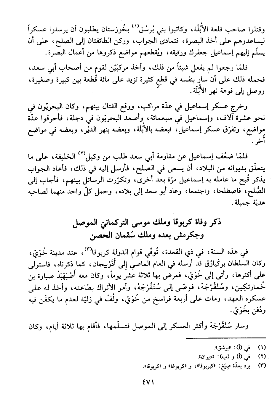 وَقَتَلُوا صَاحِبَ قَلْعَةِ الْأُبُلَّةِ، وَكَاتَبُوا بَنِي بُرْسُقَ بِخُوزِسْتَانَ يَطْلُبُونَ أَنْ يُرْسِلُوا عَسْكَرًا لِيُسَاعِدُوهُمْ عَلَى أَخْذِ الْبَصْرَةِ، فَتَمَادَى الْجَوَابُ، وَرَكَنَ الطَّائِفَتَانِ إِلَى الصُّلْحِ، عَلَى أَنْ يُسَلِّمَ إِلَيْهِمْ إِسْمَاعِيلُ جَعْفَرْكَ وَرَفِيقَهُ، وَيُقْطِعَهُمْ مَوَاضِعَ ذَكَرُوهَا مِنْ أَعْمَالِ الْبَصْرَةِ.