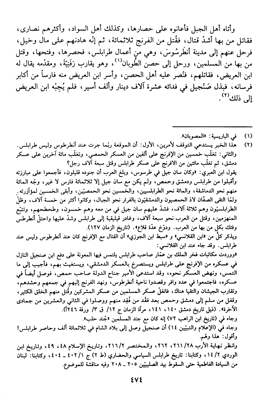 وَأَتَاهُ أَهْلُ الْجَبَلِ فَأَعَانُوهُ عَلَى حِصَارِهَا، وَكَذَلِكَ أَهْلُ السَّوَادِ، وَأَكْثَرُهُمْ نَصَارَى، فَقَاتَلَ مَنْ بِهَا أَشَدَّ قِتَالٍ، فَقُتِلَ مِنَ الْفِرِنْجِ ثَلَاثُمِائَةٍ، ثُمَّ إِنَّهُ هَادَنَهُمْ عَلَى مَالٍ وَخَيْلٍ، فَرَحَلَ عَنْهُمْ إِلَى مَدِينَةِ أَنْطَرْسُوسَ، وَهِيَ مِنْ أَعْمَالِ طَرَابُلُسَ، فَحَصَرَهَا، وَفَتَحَهَا، وَقَتَلَ مَنْ بِهَا مِنَ الْمُسْلِمِينَ، وَرَحَلَ إِلَى حِصْنِ الطُّوبَانِ وَهُوَ يُقَارِبُ رَفَنِيَّةَ، وَمُقَدَّمُهُ يُقَالُ لَهُ ابْنُ الْعَرِيضِ، فَقَاتَلَهُمْ، فَنُصِرَ عَلَيْهِ أَهْلُ الْحِصْنِ، وَأَسَرَ ابْنُ الْعَرِيضِ مِنْهُ فَارِسًا مِنْ أَكَابِرِ فُرْسَانِهِ، فَبَذَلَ صَنْجِيلُ فِي فِدَائِهِ عَشَرَةَ آلَافِ دِينَارٍ وَأَلْفَ أَسِيرٍ، فَلَمْ يُجِبْهُ ابْنُ الْعَرِيضِ إِلَى ذَلِكَ.